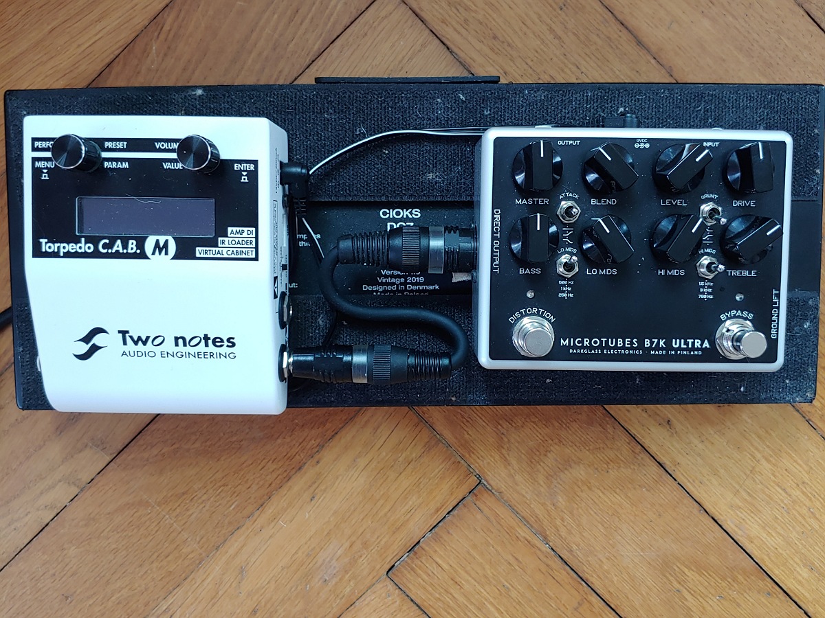 ich gehe vom out des Darkglass direkt zum amp... der Two Notes ist nur für foh oder dient zuhause als kopfhörer amp zum üben... "theoretisch" könnte man natürlich auch vom thru des torpedos zum amp.. in der praxis verursacht das aber bei einigen usern (unter anderem auch mir) brummschleifen vor dem torpedo welchen nicht mit dem groundlift des torpedos beizukommen ist.. die einzige lösung ist hier eine DI mit groundlift welche vor dem torpedo sitzt... da es auch brummen würde wenn ich einfach so vorne abbiege, ist das tatsächlich so die praktikabelste lösung... kann man sich bei weiterem intresse auch im cab m thread hier im forum mal durchlesen...Warum gehst du mit dem Direct Out in den Two Notes? Es wäre doch viel platzsparender den output zu nehmen dann hätte man sogar noch Platz für nen Mini Effekt![]()