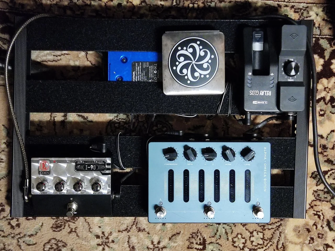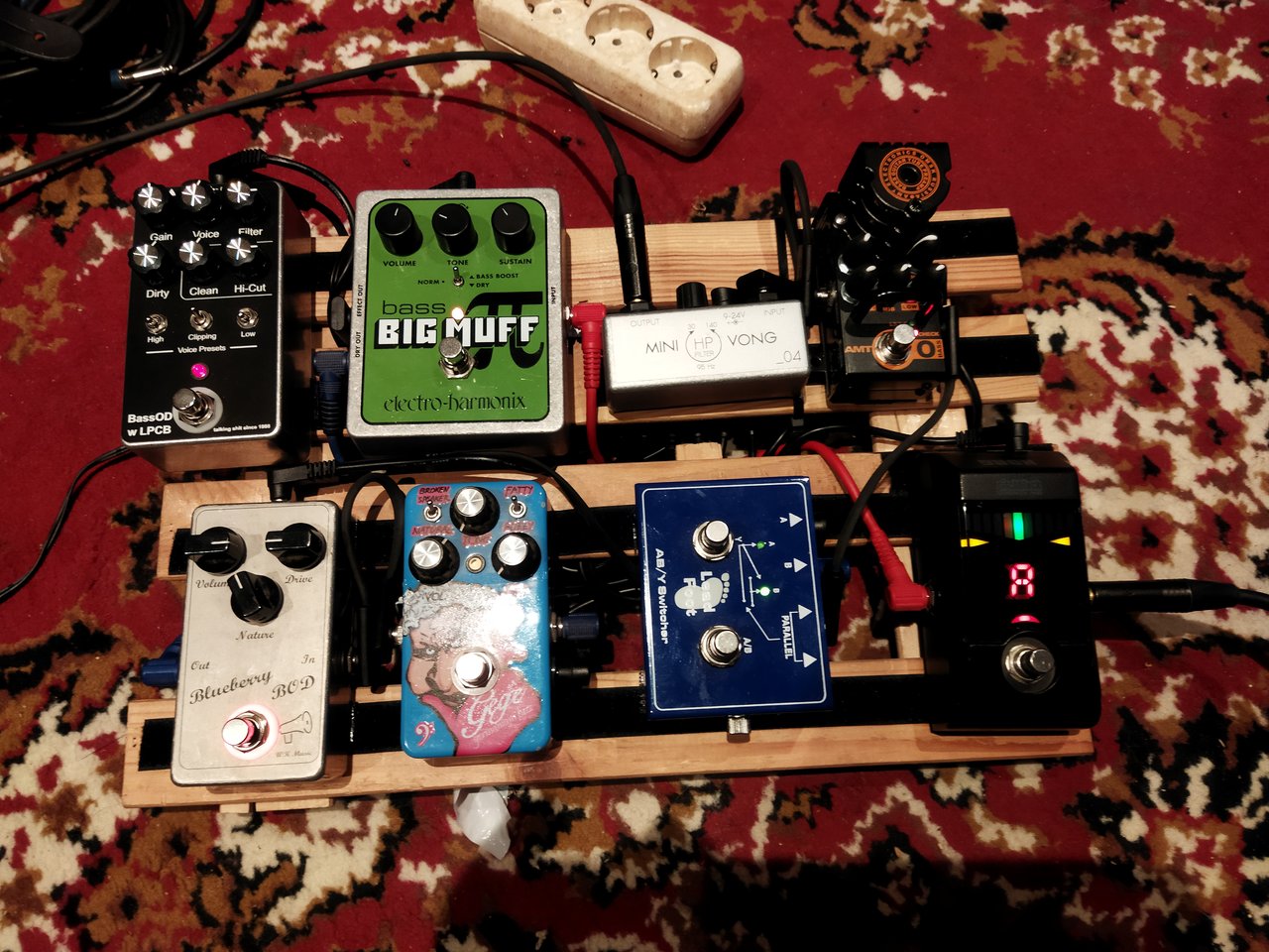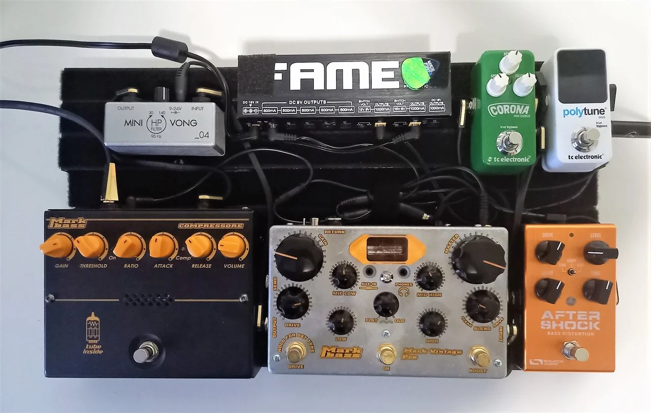 Wenn die DI nicht unbedingt passiv sein muss, dann schwöre ich total auf den Markbass Superbooster. In den wichtigen Hinsichten einfach ein fantastisches Gerät. Leider besonders schwer zu kriegen mittlerweile…Das alte Board wurde komplett zerlegt, fast alle Pedale wurden "entsorgt" (übrig blieben nur die Funke und der Chorus), dafür durfte das Alpha Omega Photon einziehen.