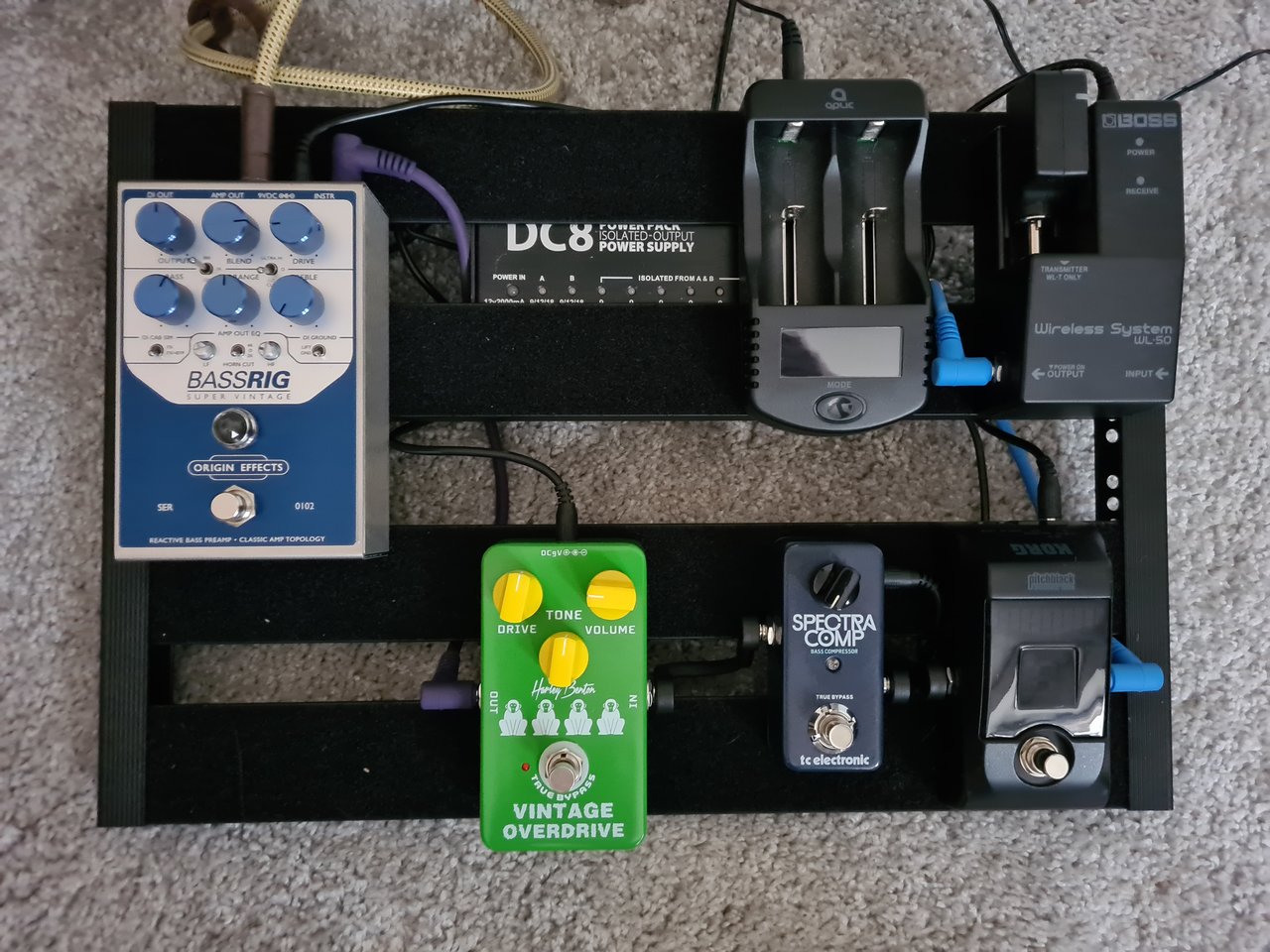 So, alles an Effekten runtergeschmissen was ich eh nicht gebraucht habe in der Praxis (Chorus, Reverb, Delay, Octaver), neuen Overdrive verbastelt und den Forcefield Comprossor gegen den SpectraComp getauscht - WELTEN dazwischen. Ach ja, und der