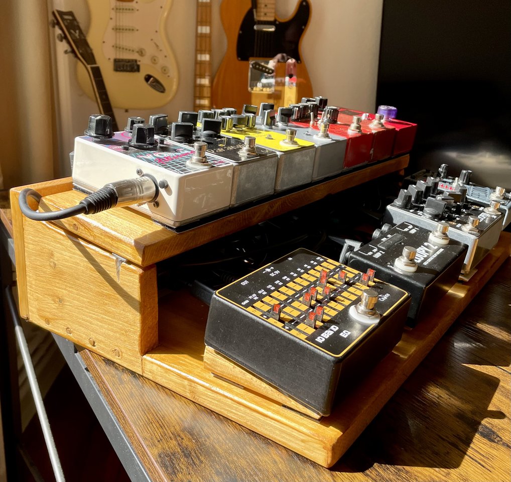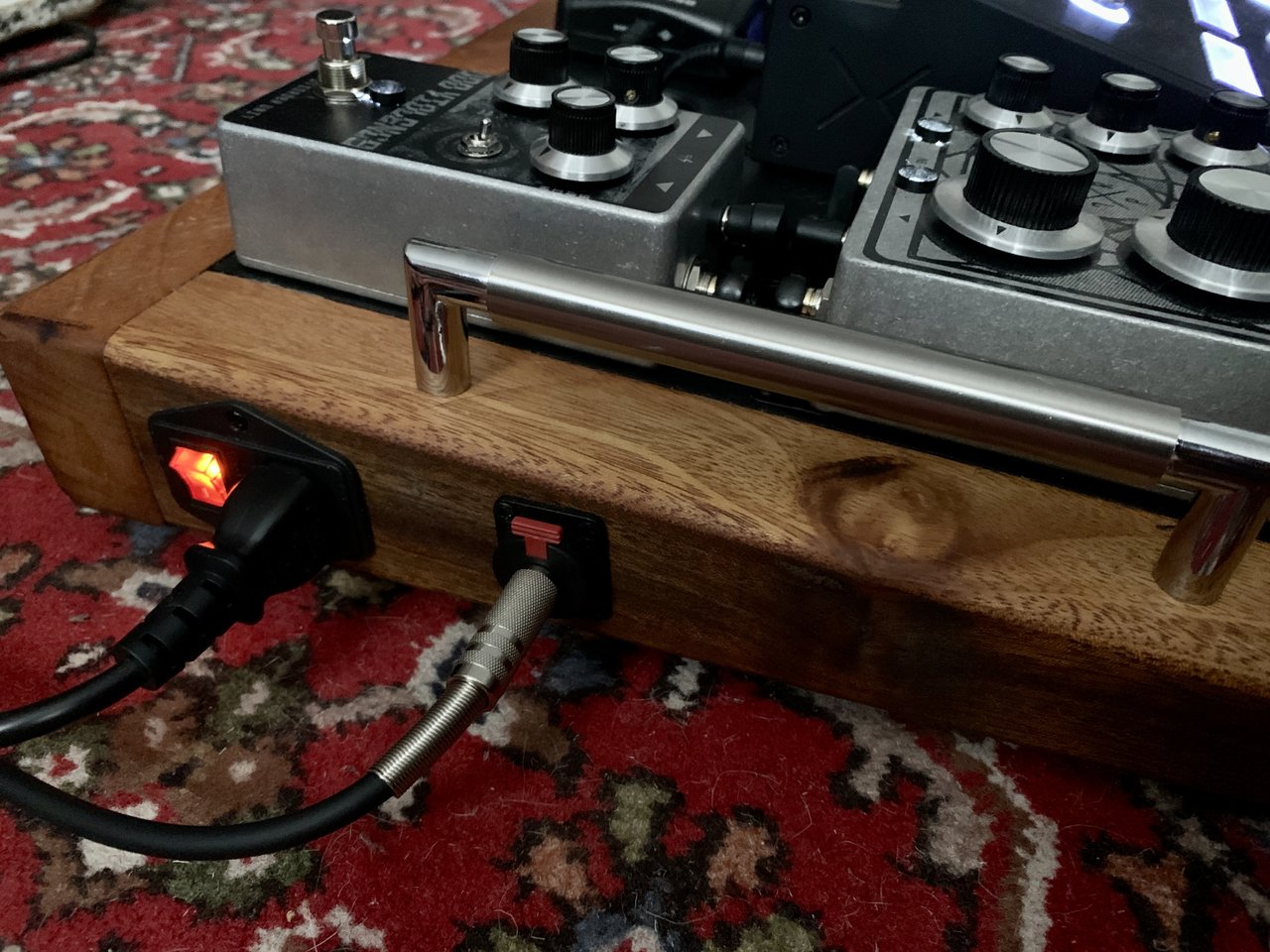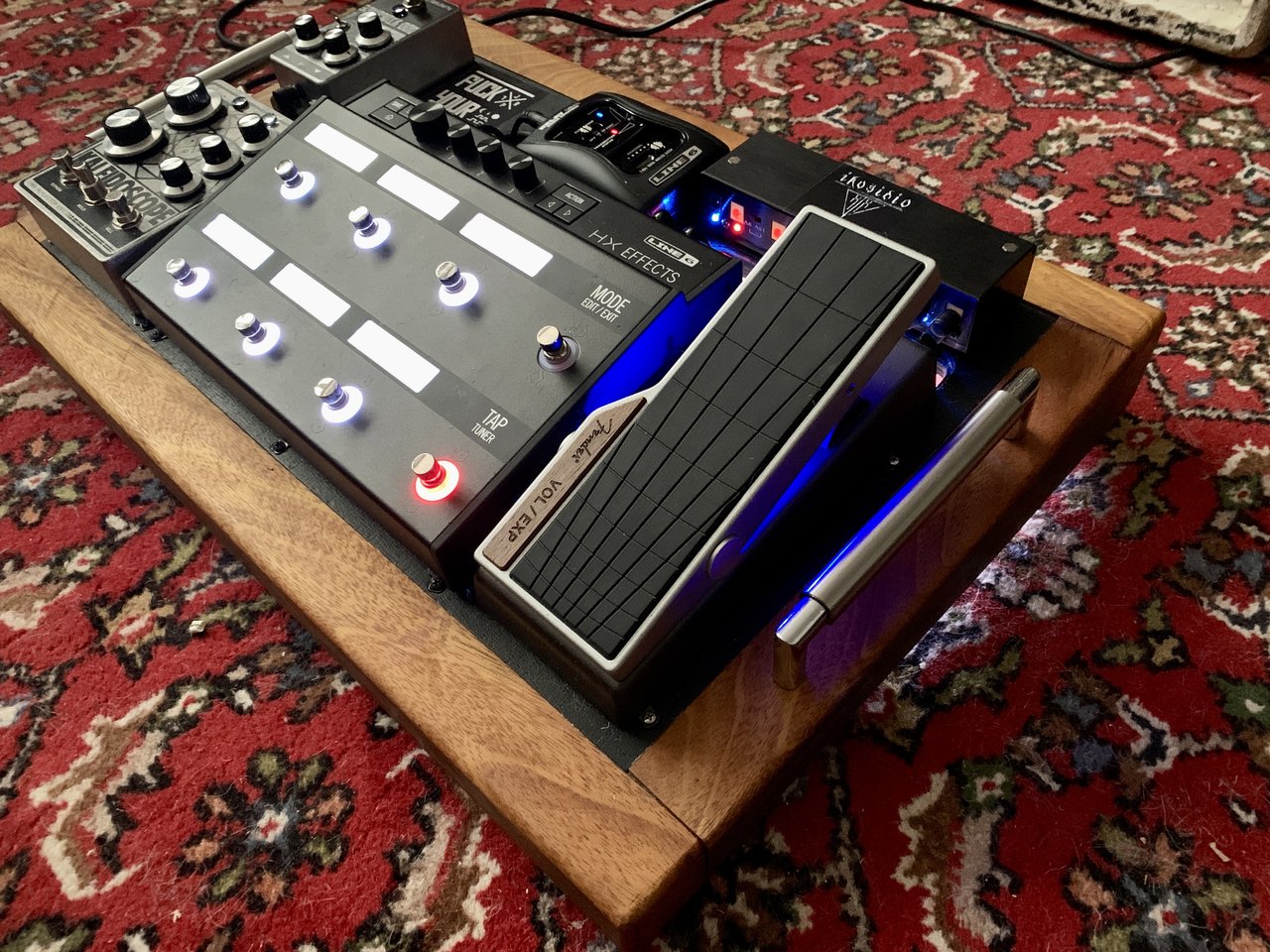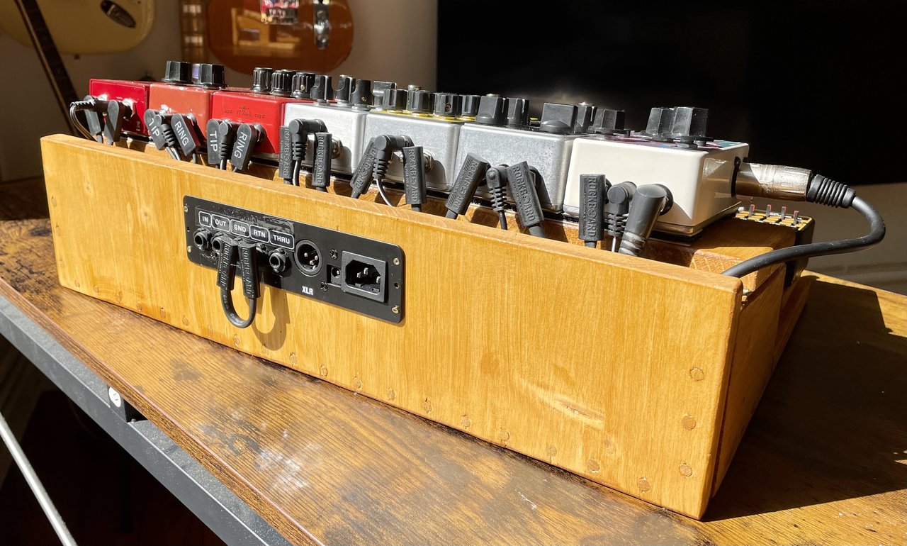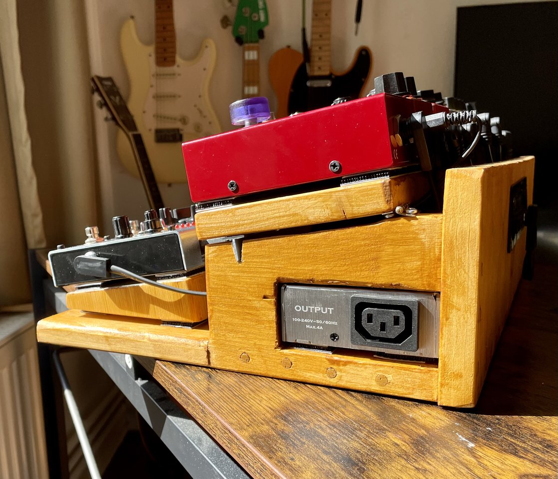 Die Fräsungen sind für exakt diesen Aufbau, im Seitenteil sind eine schaltbare, separat gesicherte Kaltgerätebuchse und Neutrikbuchse für die Verbindung zum Amp verbaut. Das Expressionpedal ist zugegebenermaßen auch etwas nach Optik ausgewählt: ich steh auf die super gut passende Holzapplikation. Und es tut genau was es soll.