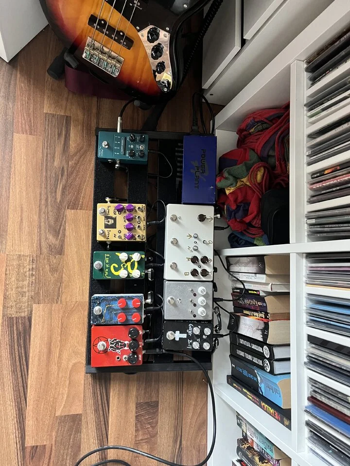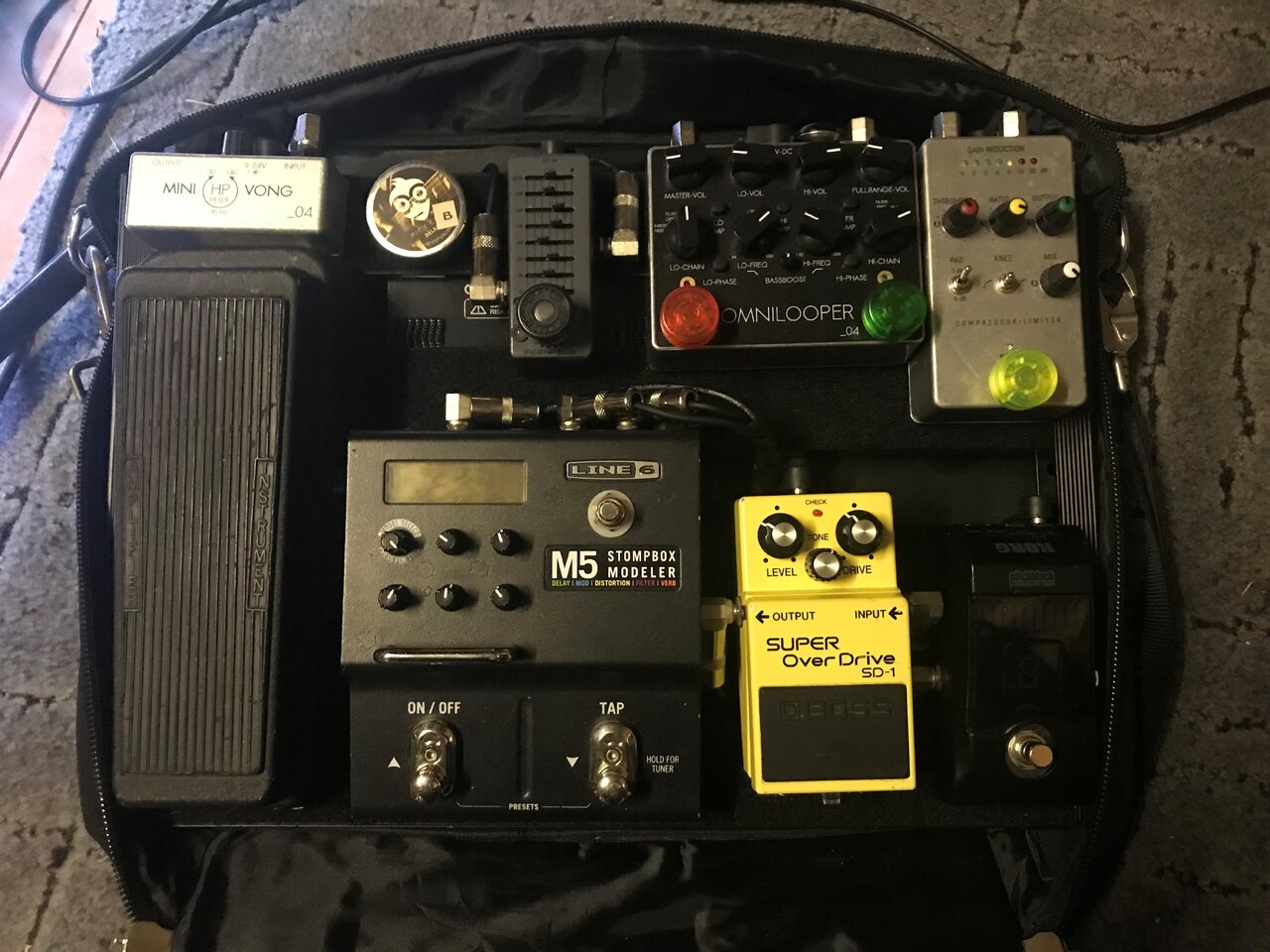 mit SD-1 und M5+Expression-Pedal im Hi- und Pumpernickel im Lo-Pfad > EQ > Mini-Vong; aus dem M5 benutze ich produktiv Phaser und Wah, beim Daddeln im Probenraum auch gerne mal Triplet-Delay, Tremolo, Chorus, Boost oder Distortion bzw. Fuzz (dann als Alternative zum SD-1).