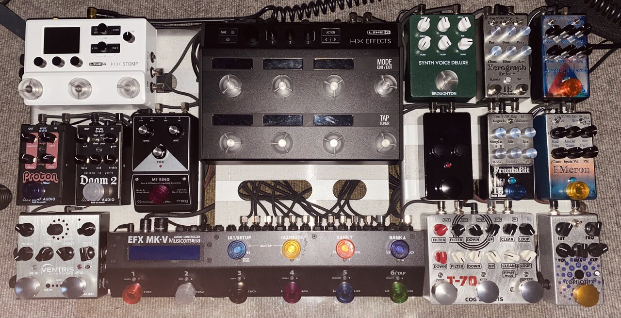 Starkes Board!! Nen HX Stomp, ein Effects und noch ne Menge anderer cooler Pedale…. Und ich hab mich gefragt ob ich mir’s leisten soll neben dem Stomp noch *eine* andere Zerre am Start zu haben