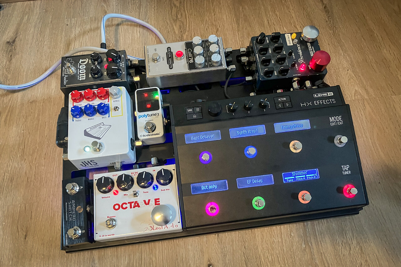 Eigentlich wollte ich mir mit dem HX Effects ein Zweitboard aufbauen, um nicht zu schwer zu schleppen… (nach zwei Anläufen vorher mit HX Stomp (zu klein) und POD GO (zu eingeschränkt).Dann gefiel das HX FX mir so gut, dass ich mein großes Board in Einzelteile zerpflückt und ein Hybrid-Board aufgebaut habe. Für mich also das beste aus zwei Welten.