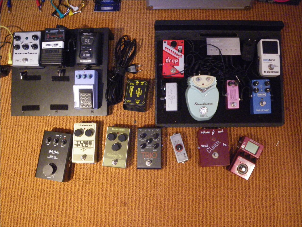 (unter dem linken Board versteckt sich noch eine Steckdose für das Retrobass Netzteil und ein Ojay Strymon)