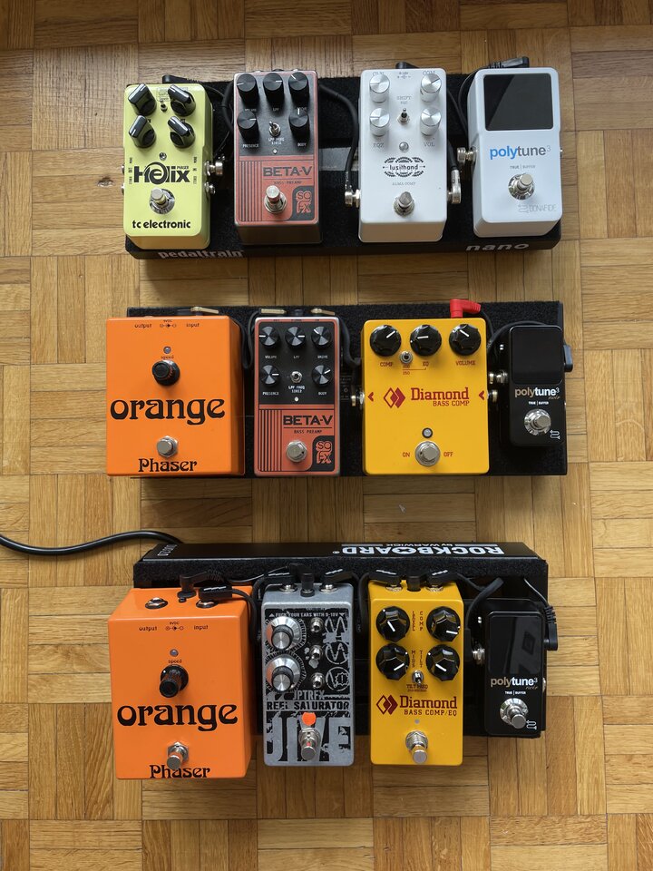 Ne ganz blöde Frage, weil ich es gerade nicht kapiere: Das sind wirklich 3 Boards, in denen teilweise die gleichen Effekte vorkommen oder? D.h. du hast absichtlich immer nur ein kleines Board dabei (wegen der Schlepperei vermutlich) aber du benutzt grundsätzlich nur 9 verschieden Einzelgeräte (weil deine Suche nach Sounds abgeschlossen ist...?...) ?Tuner, Kompressor, Overdrive und Phaser, mehr brauche ich nicht für meinen Sound.
