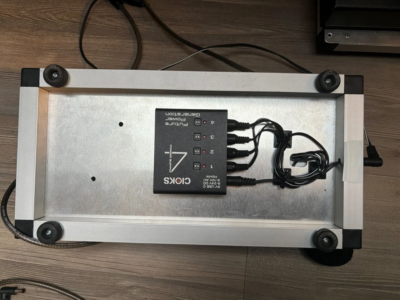Power gibt es von einem Truetone CS6 unterm Main Board und einem Cioks 4 Expander unterm Synth Board. So kann man das ganze mit einem einzigen Kaltgerätestecker betreiben.