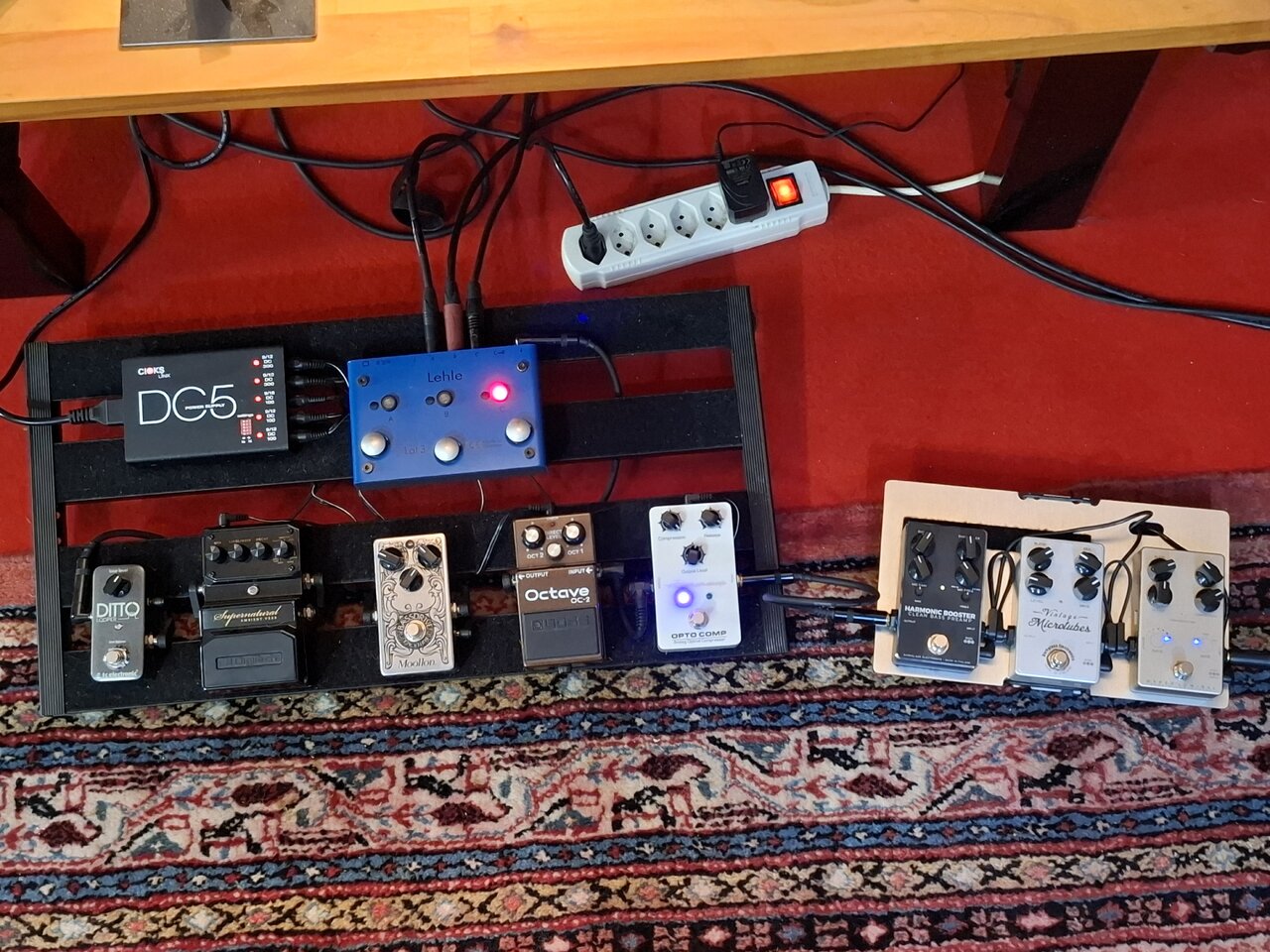Ein wenig geupdatet... Vor allem weil mich das Rauschen des Boards etwas nervte und ich in den letzten Wochen beim Spielen ohne Board doch den Eindruck hatte, dass der Sound transparenter ist. Letzteres ist nun sicherlich nicht die sonderlich neuste Erkenntnis, aber man kann ja Abhilfe schaffen. Also musste ein Looper her. Vor Urzeiten hatte ich mal einen Boss LS-2, der brachte aber selber Rauschen mit. Nun hatte ich zunächste einen MXR Noise Clamp besorgt, der hatte aber eine für micht nicht hinnehmbare Latenz in der Ansprache. Gelandet bin ich nun bei einem Little Lehle II und der gefällt mir.