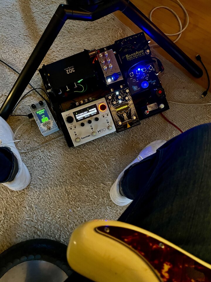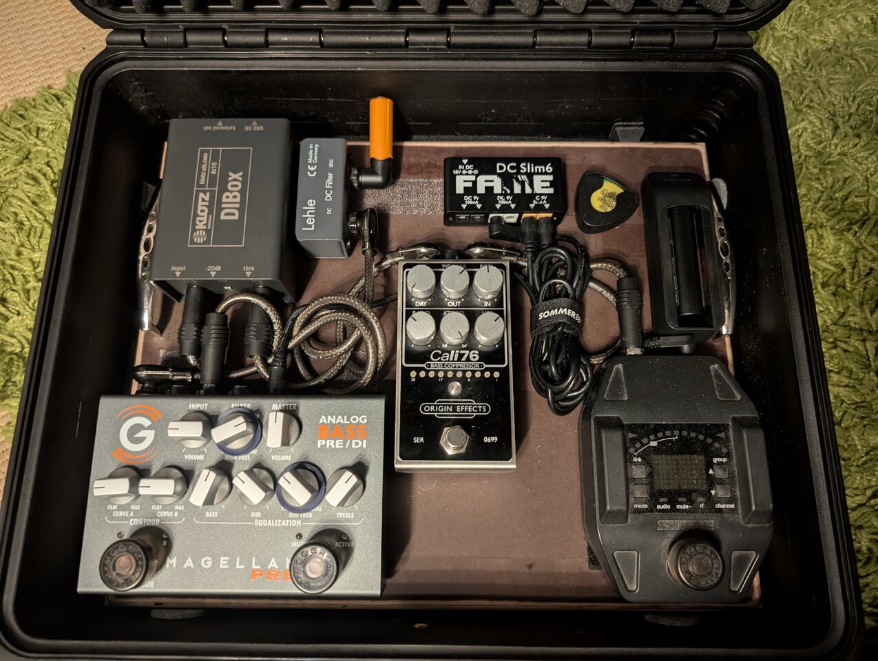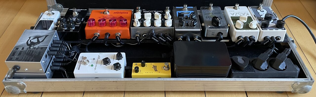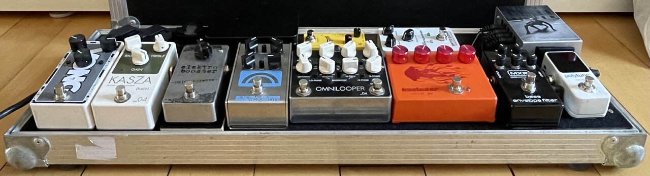 Die Kette ist Tuner > Envelope > Optocomp > Jellyfish > Omnilooper; im Hi-Insert sind Booster > Prototype > Kasza; im Lo-Insert ist der Aguilar DB 599; zum Schluss geht alles durch den Vong.