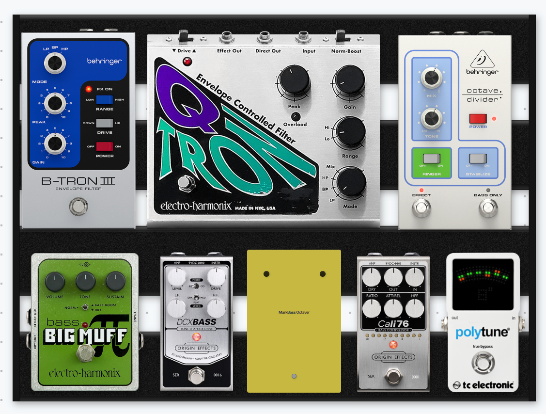 Polytune 2 --> Cali 76 Comp --> MB Octaver --> Octave Divider --> DCX Bass --> Bass Big Muff --> QTron --> B-Tron
