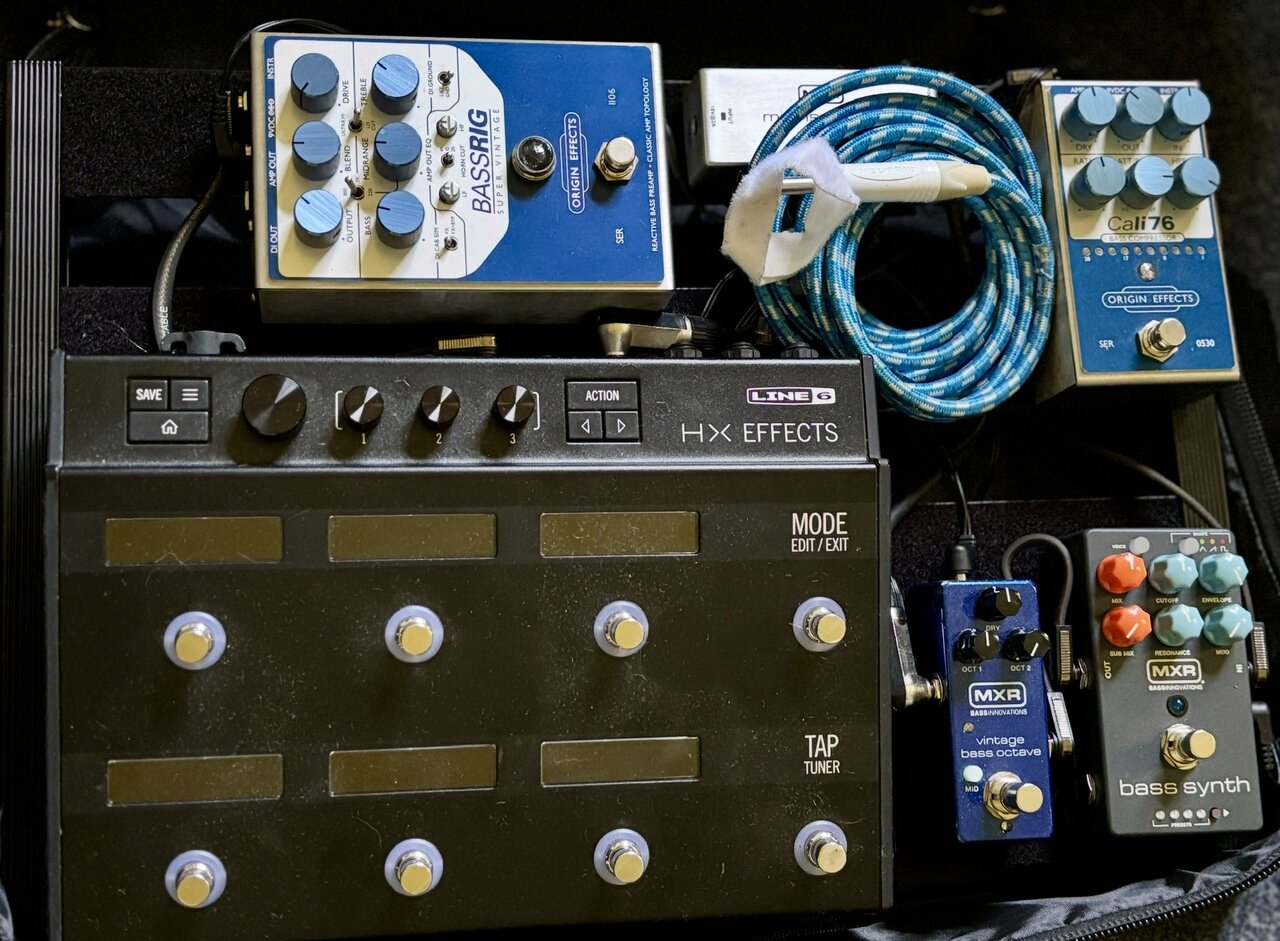 Ziel war es, das eingespielte Setup etwas kompakter zu realisieren. Statt Rockboard Quad 4.1 ist nun das Voodoo Lab Dingbat Small EX die Basis. Hat gut geklappt: quasi gleicher Funktionsumfang und nun die Möglichkeit, das ganze auch mal im Softcase in der Bahn transportieren zu können.