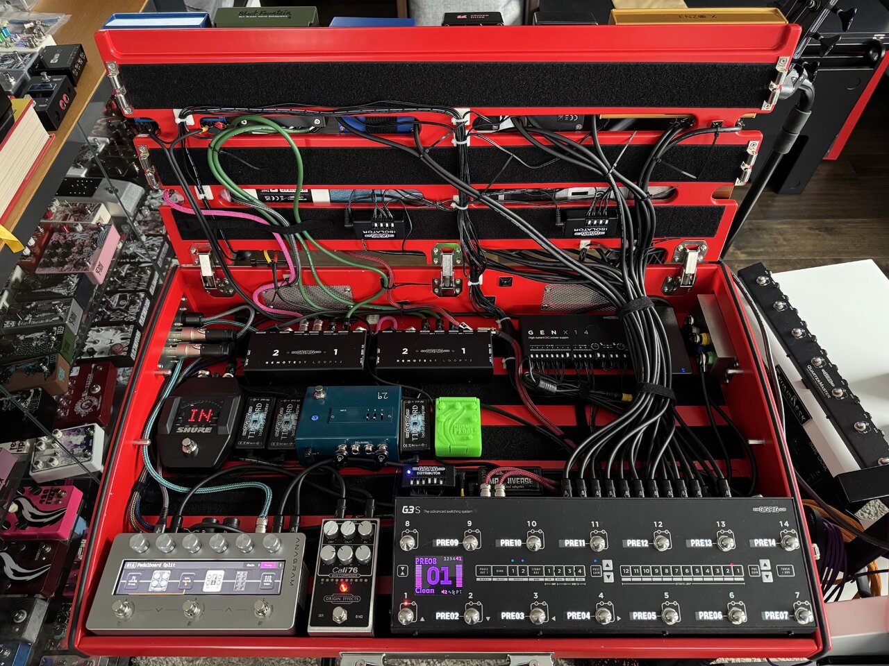 Das Signal geht von der Patchbay durch den Shure Empfänger zum 29 Pedals EUNA, dann zum Cali 76 und von da aus in das Anagram. Das G3S sitzt im Loop Mono Send/Stereo Return. Auf den XLR Outs vom Anagram liegt eine Amp-/Boxen-Simulation (aktuell Peggy, aber das kann sich je nach Anwendung ändern), die Klinkenausgänge gehen ohne Bearbeitung, den Comp hintern Return mal ausgenommen, zu meinen Amps, wenn mal ohne IEM gespielt wird oder genug Platz ist, um die Amps zusätzlich auf die Bühne zu nehmen.