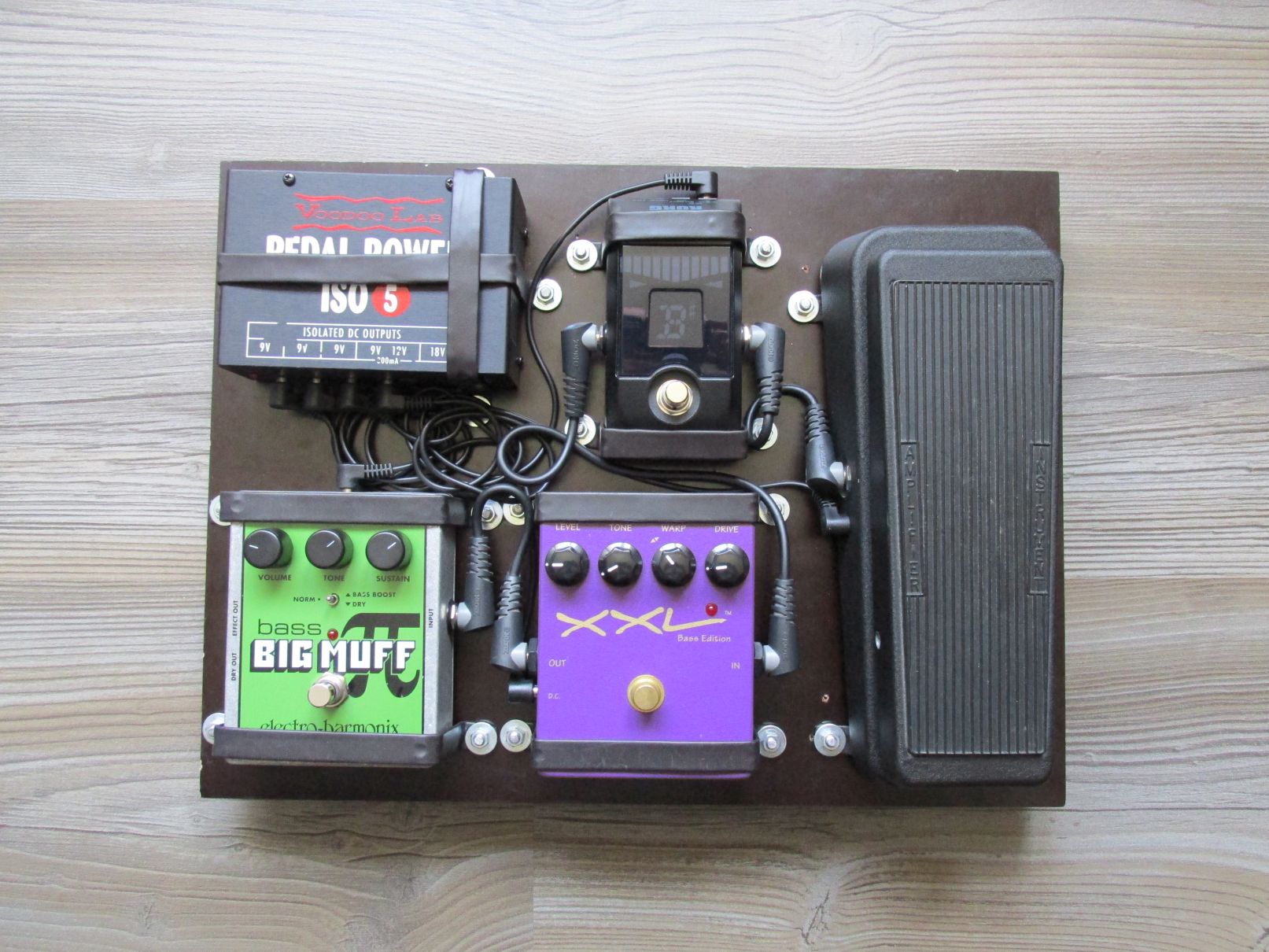 Ich habe mein Effektbrett leicht überarbeitet. Die Effekte sind die selben geblieben und auch die Anordnung ist unverändert. Die mit Schrumpfschlauch überzogenen Lochbänder waren bisher mit kleinen Holzschrauben befestigt, aber bei den Schrauben sind, trotz Verwendung des passenden Schraubendrehers, die Köpfe schnell ausgenüddelt. Deswegen habe ich nun an den richtigen Stellen mit einem Bohrer vorgebohrt und Schloßschrauben, die ich noch etwas kürzen musste, mit Unterlegscheiben und Muttern zur Befestigung verwendet. Dummerweise ist mir beim Bohren ein paar Mal der Unterlegklotz verrutscht, so dass das Holz etwas ausgerissen ist.