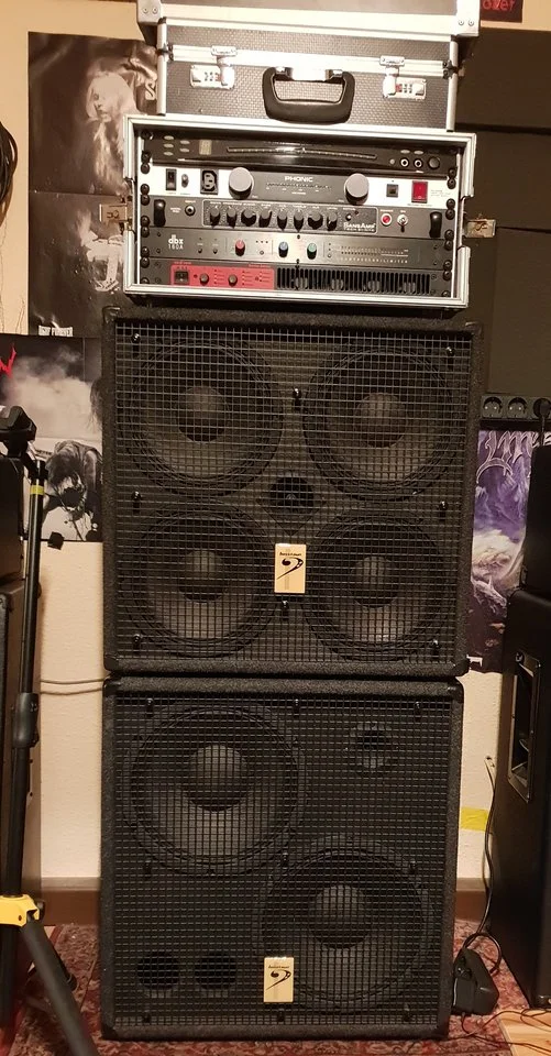 Die Box untendrunter ist eine JBL mit K140 Speaker und steht bei mir fest im Bastel/Übekelller. Für den Stereobetrieb habe ich zwei 2x10er mit EV Speakern.