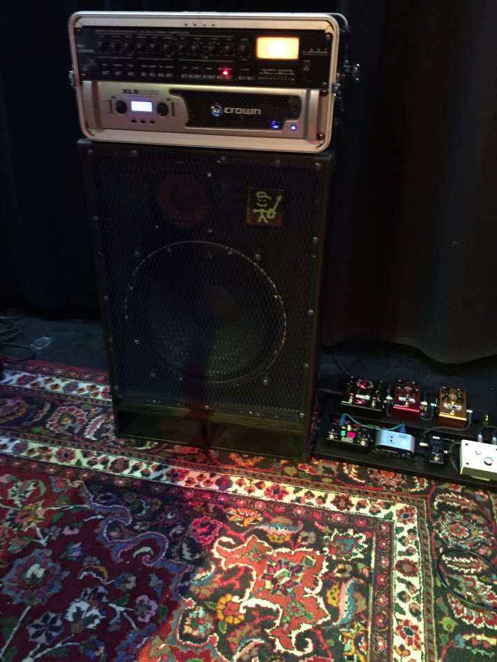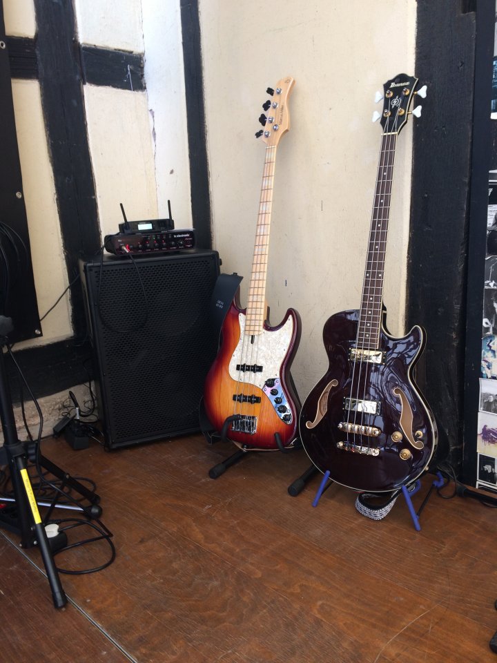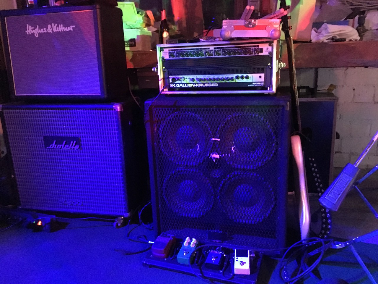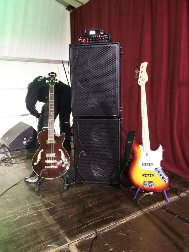 Der letzte Werkstattgig mit meinen Schweinerockern. Gallien Kruger 400 mit Endstufe auf 14 Uhr - das drückt und rotzt. Und behauptet sich gegen die 3 x 12" von Lead- und 4x12" von Rhythmusgitter.
