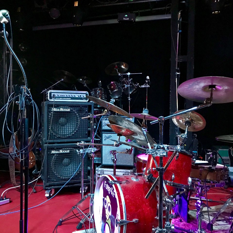 Hinten links, mein Ampeg SVT II nonpro auf 2x JBL BB140, nach vorne über JDI zwischen Amp und Box abgenommen.