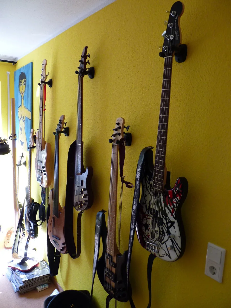Starke Sammlung, da haben wir einen sehr ähnlichen Geschmack!von links: Vintera 60s JB, Höfner HCT 500/1, Vintera 70s JB, 1996er Stingray, Nate Mendel-P, JMJ-Mustang …