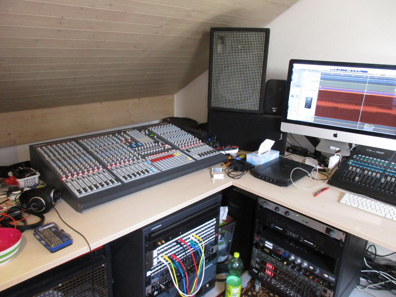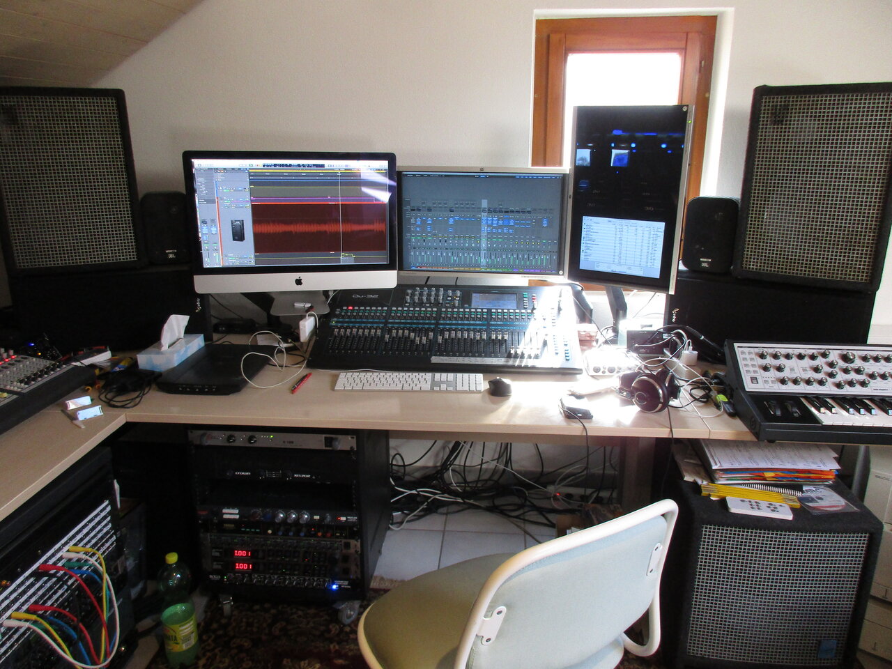Was sind das für Monitore da, also die mit der silbernen Bespannung?ich habe gerne das Digipult (mit DAW Automation) vor der Nase, auch weil ich da genau in der Abhöre sitze. Die Tasten sind rechts daneben und links der Analogschlitten. Klampfen, Bässe, Drums und Tröten sind hinten. PA, Endstufenracks usw. lagern ein Stockwerk tiefer im Gästezimmer