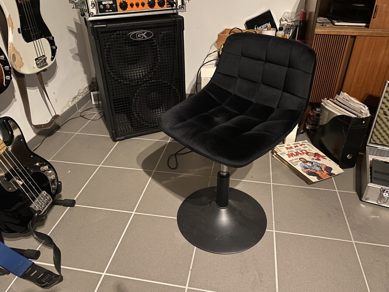 Apropos Üben und Spielen im Sitzen….ich? Ich kann im Stehen oder im Sitzen üben und spielen. Zum sitzen habe ich einen höhenverstellbaren Hocker in Holz von Ikea (wäre als Barhocker gedacht gewesen, damit kann man aber super Gitte, Bass und Kontrabass spielen). Wobei ich Gitte und Ebass auch auf meinem Bürostuhl spiele, das ist nicht ohne Grund ein Modell ohne Armlehnen.