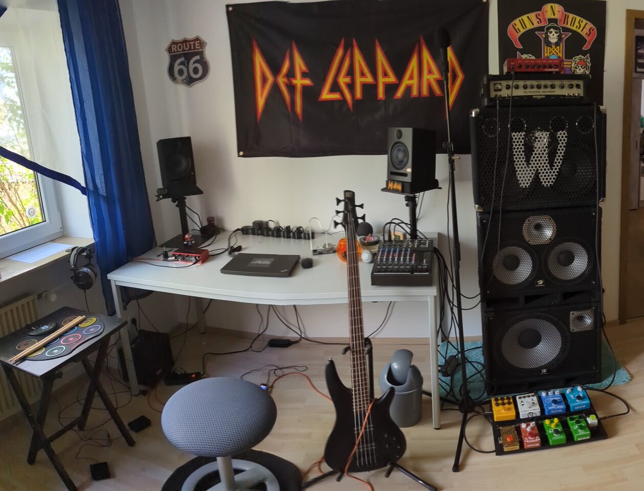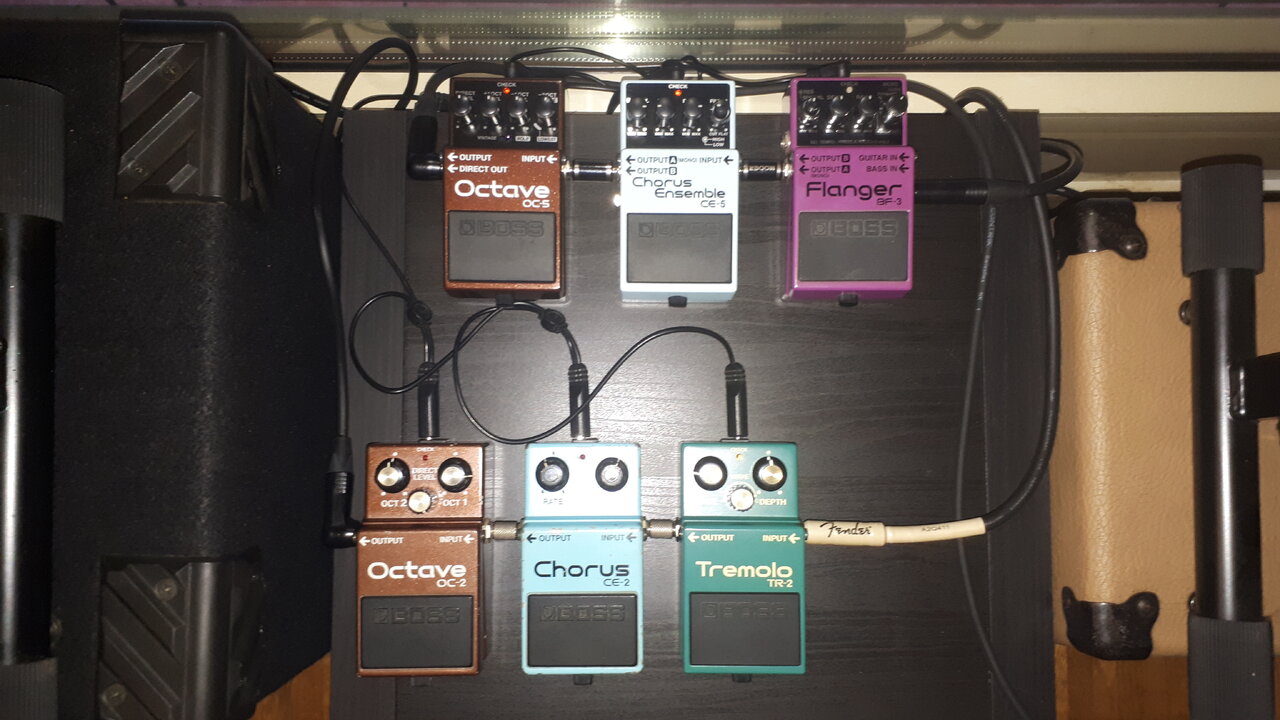 So sieht meine kleine Ecke momentan aus, geschmückt mit einem 1982 JV Jazz Bass, einem 2015 CV Preci und einem alten Sunn Amp. Habe bisher nur Chorus-Effekte, da sollen dann demnächst noch ein paar andere dazukommen.![]()