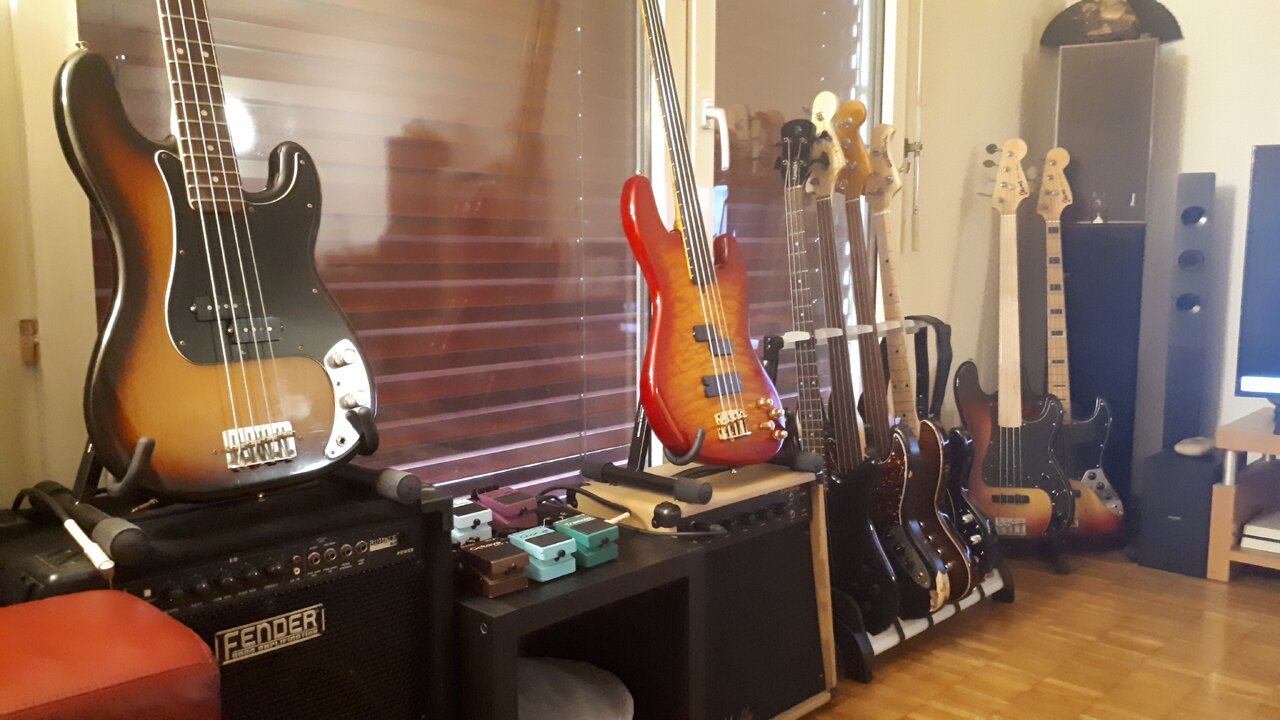 Ah das GAS ist groß in dir.So sieht meine kleine Ecke momentan aus, geschmückt mit einem 1982 JV Jazz Bass, einem 2015 CV Preci und einem alten Sunn Amp. Habe bisher nur Chorus-Effekte, da sollen dann demnächst noch ein paar andere dazukommen.![]()