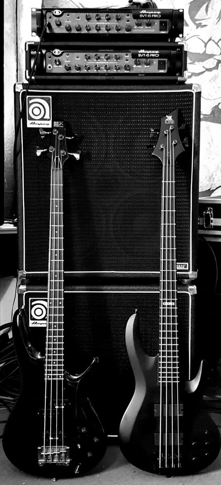 2x Ampeg SVT 6 Pro, ein mit JJ-Röhren und ein mit GrooveTubes, glaube ich. Die JJs im Vergleich klingen weich, schön mit aufällig mehr Sparkle. Insgesamt finde ich den Grunt dieser Amps einfach nur geil. So sind sie dann wieder bei mir eingezogen.