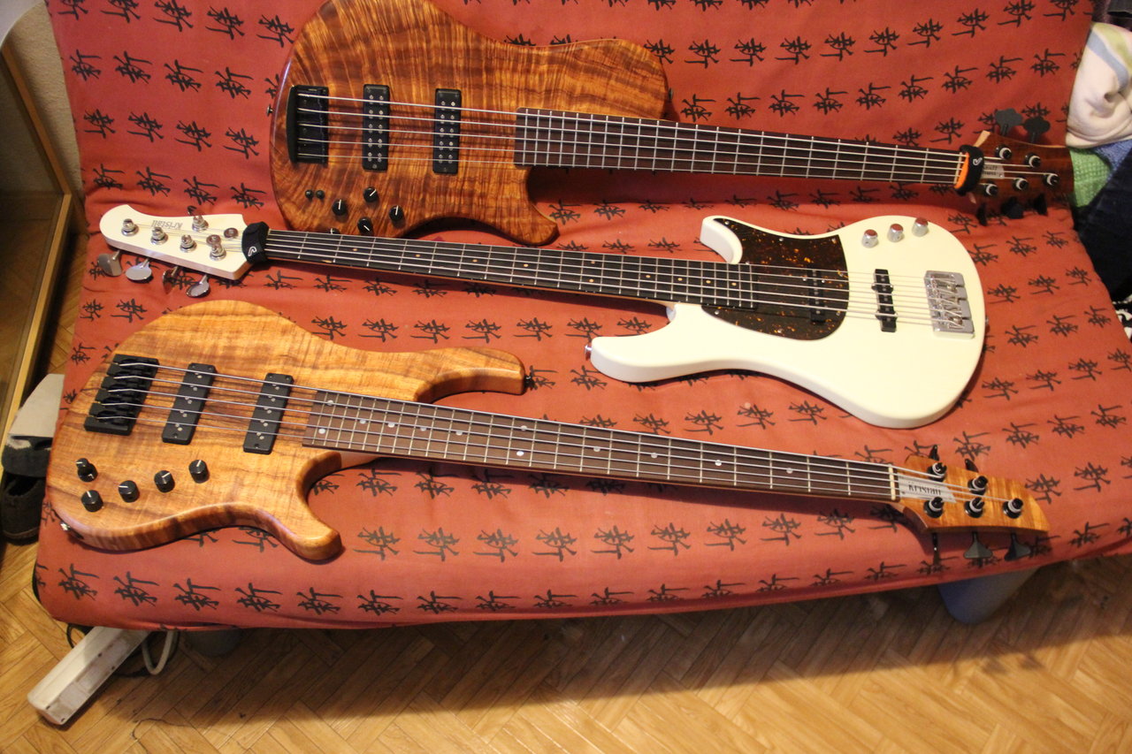 und der 3. ist ein home necktrhu hals aus maple und bolivean rosewood auch brazilian rosewood und koa massiv body wings , trotzdemm relativ leicht , dieses bass wäre ideal fur ein solo spieler .