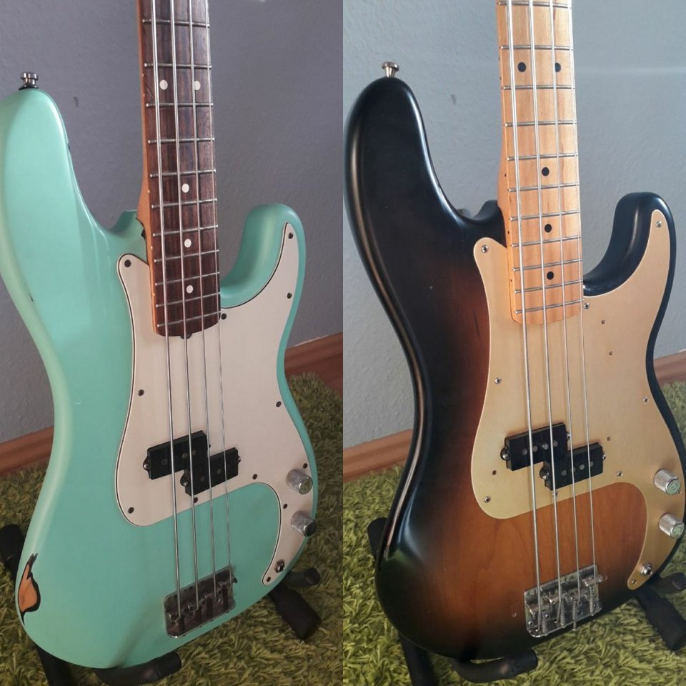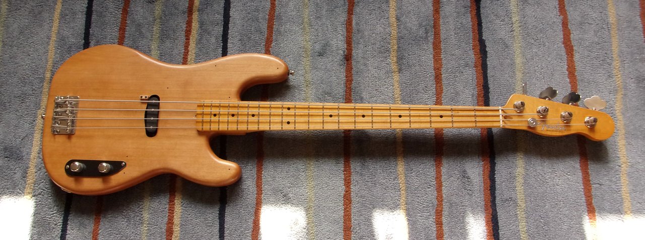 Blackstar UK gekauft, die hatten ihm auch den Vintage-Tint verpasst und das coole ist daß der Hals zufällig auch noch Ton in Ton mit dem Body ist ( der Body ist nur mit ein paar Schichten Tru Oil versiegelt ), der PU ist ein handgewickelter Stacked von Bassculture.