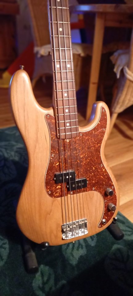 Hi zusammen, ich nochmal ..., weiß gar nicht ob ich diesen hier schon mal gepostet hatte, der Body ist aus Roterle den mir Andreas Großer ( Deutsches Tonholz ) schon vor einigen Jahren gemacht hatte, zwischenzeitlich hatte ich den Bass mit einem anderen Hals verkauft gehabt und letztes Jahr irgendwann wieder zurück gekauft. Der Hals ist ein Hosco Japan mit fettem C-Profil, den hatte ich über