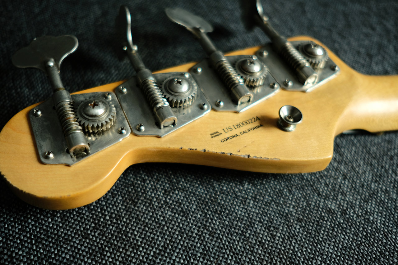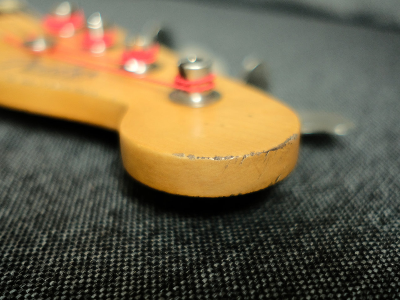 Der Korpus und das Pickguard kamen bereits geaged zu mir, die Bridge war auch leicht geaged. Alle anderen Teile habe ich selber auf alt getrimmt, verschiedene Methoden ausprobiert, viel Spaß gehabt, noch mehr gelernt und eine Fender Brücke kaputt gemacht (festgerostete Madenschrauben). Daher kam als Ersatz direkt die Relic-Bridge von Gotoh drauf, welche ich noch nachbehandelt habe. Beim Zusammenbau kamen dann noch ein paar Dings und Dongs dazu.