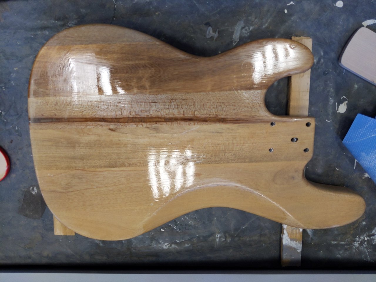 Ein Querschnitt durchs Holzlager der Body – den hätte man fast transparent lassen müssenAnschließend alles nochmal schleifen und Porenfüller drauf. Die groben Macken habe ich im Body gelassen, die sollen ja später auch wieder rein