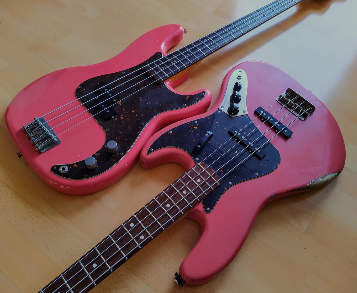 Ich weiß, dass da eher ein rötlicheres "drauf gehört" - ist in Geddys Bass Book zu genüge abgebildet. Aber mir gefällt ein dunkles, braunes Tortoise einfach besser. Das Preci-Pickguard ist von Rockinger und das vom Jazz ist von Montreux.Gefallen mir auch.
