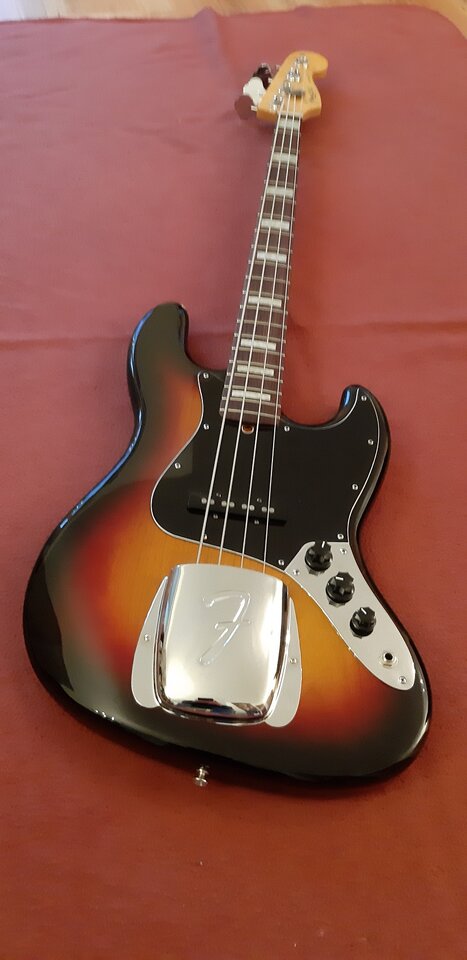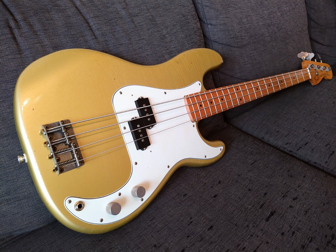 Squier Vintage Modified Precision Bass der mal Amber Natur war. Leider war der Ahorn Body einer der sehr hässlichen dreiteiligen und da kam nach und nach die Idee dem ein neues Outfit angedeihen zu lassen.