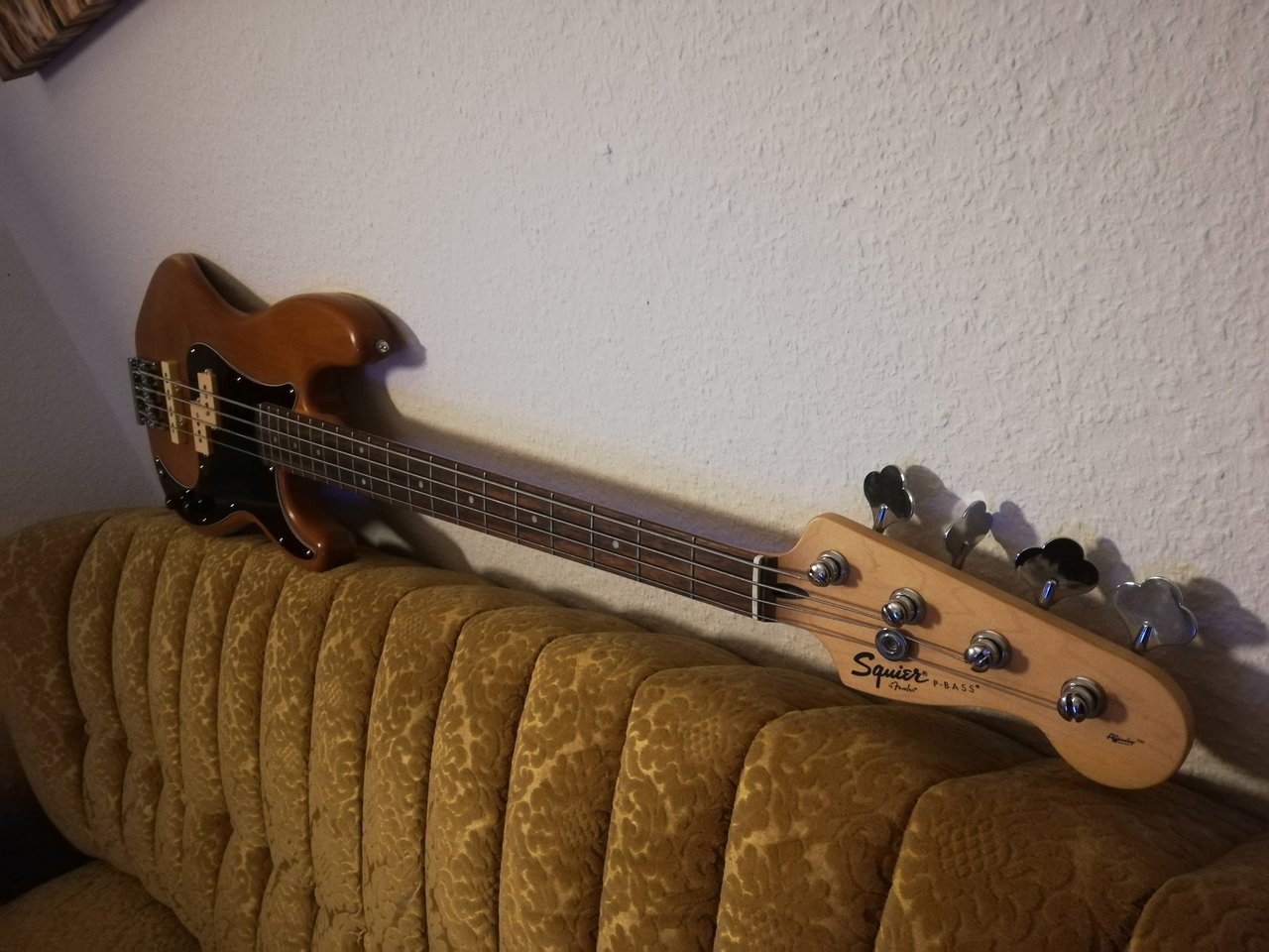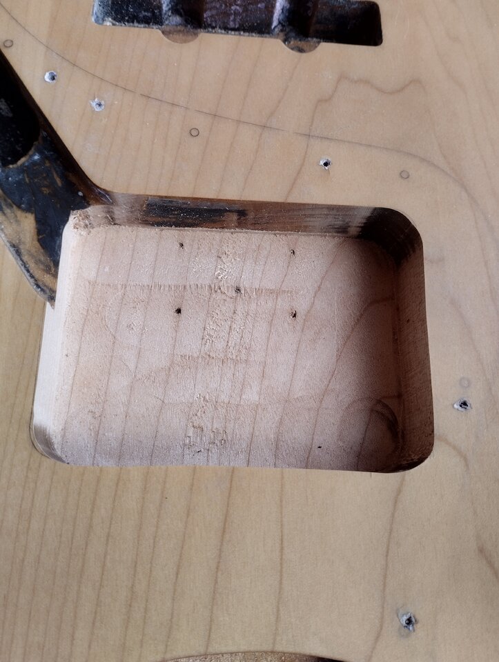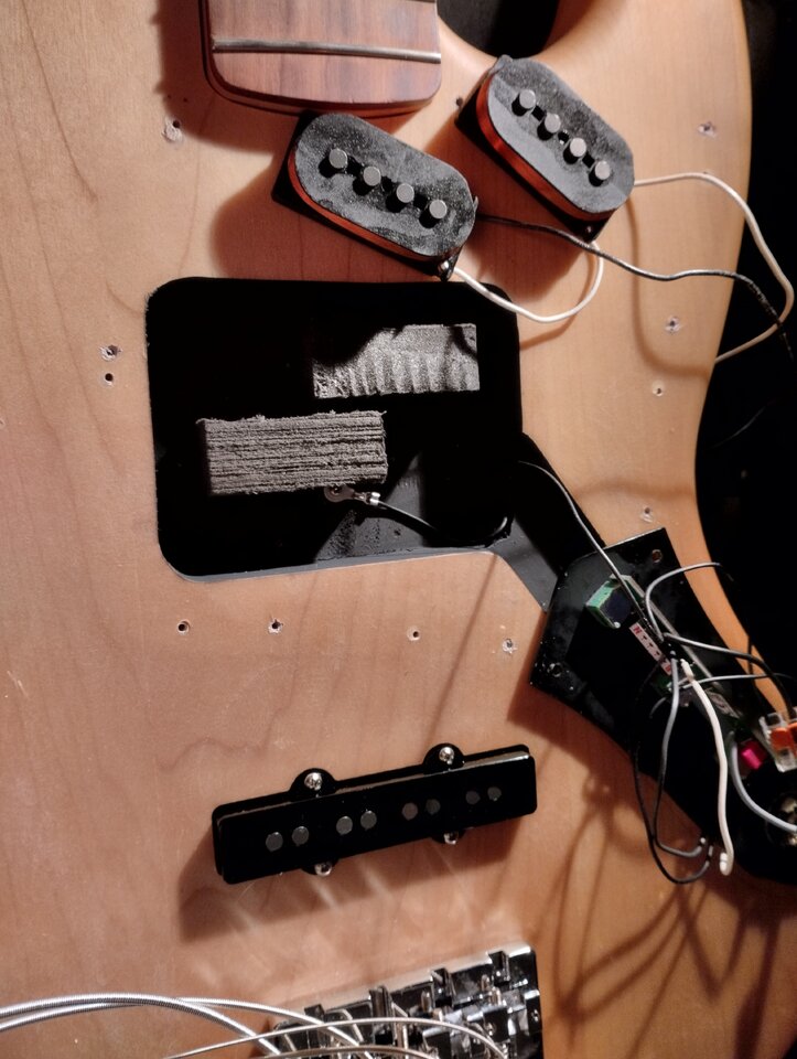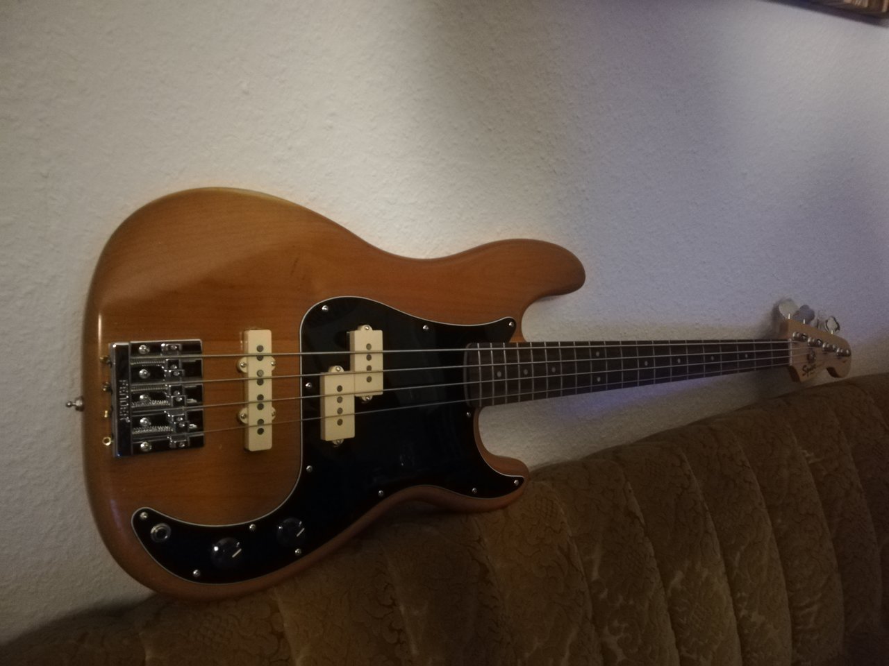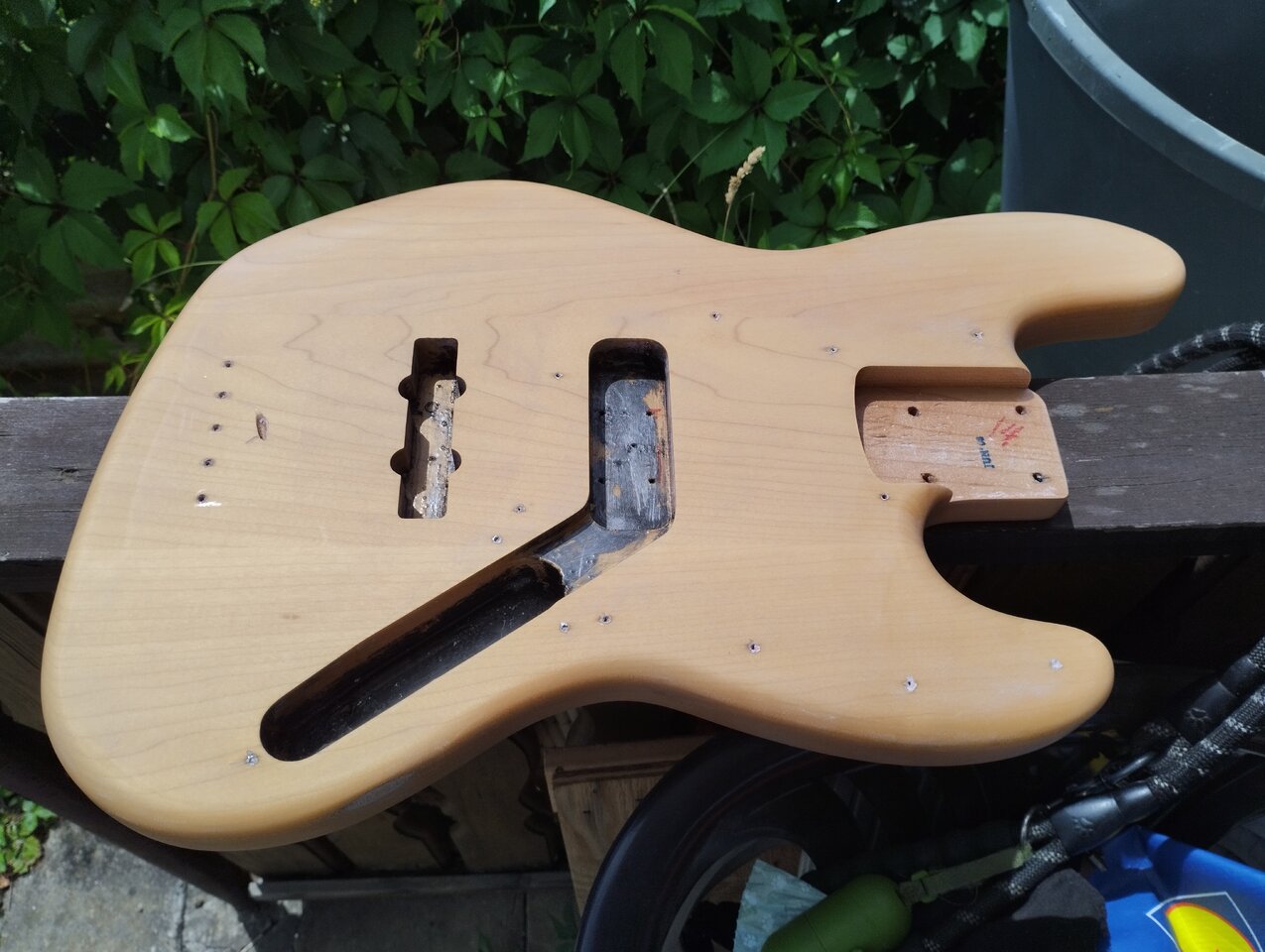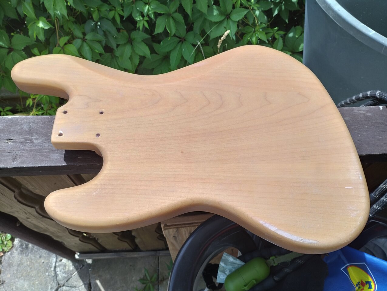 Übrig blieb der Korpus mit mattiertem Klarlack. Hat mir dann im Sommerlicht doch ganz gut gefallen. Das Hoppus-Pickguard passt um die Buchse leider nicht gut auf den Korpus. Dazu braucht es wahrscheinlich tatsächlich einen Body wo es eine Verengung hinter der Input-Buchse gibt. Das Bild mit dem blauem Body veranschaulicht es. Vermutlich könnte man mit entsprechender Pickupfräsung aus einem aktuellen Gold Foil einen Hoppus machen, da dort ebenfalls zwei Schrauben hinter der Buchse sitzen. Apropos Pickup-Fräsung. Ein pensionierter Mitarbeiter der Oper hat mir eine schöne Poolfräsung gemacht. Kostete paar Packungen Geleebananen. Anschließend Abschirmlack. Da das Hoppus-PG also nicht gepasst hat bin ich umgestiegen auf eine VBT-Richter Elektrik und ein Squier VM Pickguard von earlpilanz. Fender HiMass Bridge weil günstig. Fender Yosemite PJ Set weil kannte ich noch nicht. Schwarze Kontrollplatte von Bassparts. Der Hals ist ein einfacher Fender Player Precision MiM mit dazugehörigen Std. Mechaniken. Unterm Strich ein lehrreiches Projekt mit viel Schleifarbeit und Erkenntnissen. Falls jemand noch mehr sehen möchte, einfach Bescheid geben. Ich kann in diesem Post nur 10 Bilder einfügen.