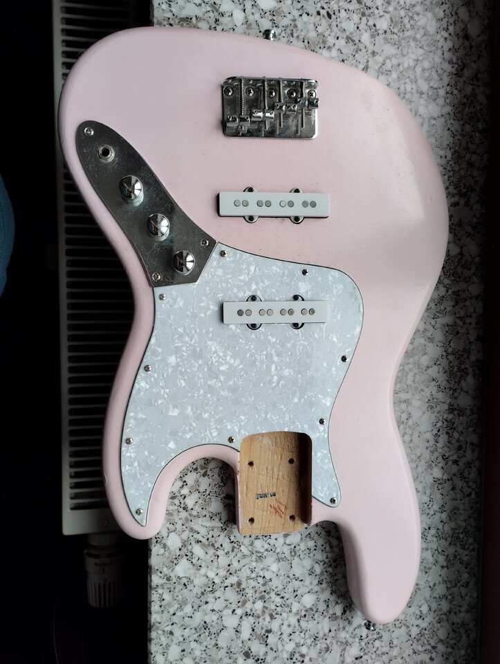 Angefangen hat es mit einem Squier VM Body mit klebrigen Shell Pink Nitrolack. Als ich den Body sah, kam mir direkt die Idee mit dem Shellpink Hoppus.