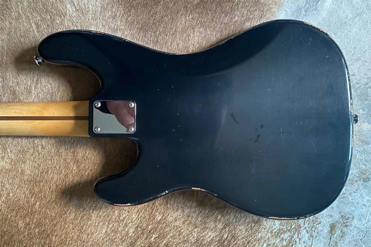 Der. Vorbesitzer wollte unbedingt einen in Natur. Also hat er die Farbe abgeschliffen und dann festgestellt, dass der Body aus ziemlich langweilig aussehenden Holz ist.
