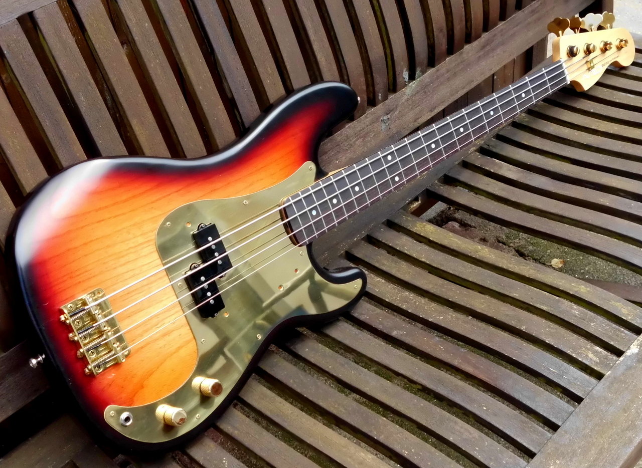 Der erste war mal ein Squier Affinity Preci. Der Pickup hat ganz ordentlich geklungen, war aber mikrofonisch. Also einen Fender Pickup geschossen und rein damit. Ein Kumpel hat mir dieses "gold anodized" Pickguard vermacht, jetzt sah der Preci schon etwas vintage aus. Weil mir der Sound gefallen hat, ich aber kein Fan vom Preci-Halsprofil bin, hab ich mir einen JazzBass-Hals von Mighty Mite besorgt. Die Mechaniken hab ich gelassen, die sind ok, vielleicht kommt noch eine massivere Brücke drauf.