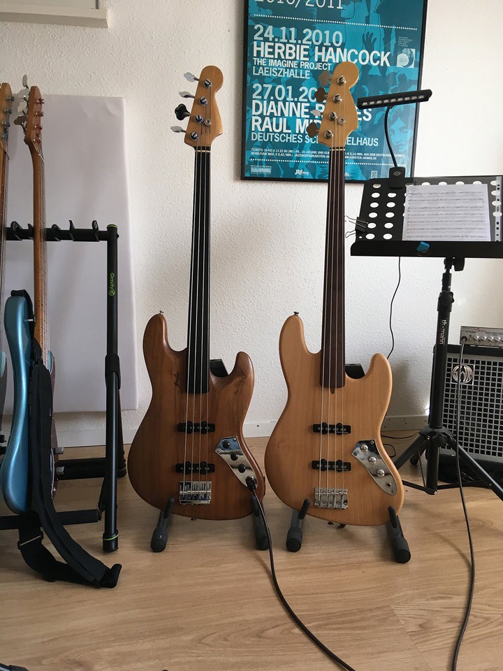2) entweder korrigiere ich nur die schief sitzende Bridge oder ich ersetze die durch eine Göldo HiMass, die ich von @BobButcher138 bekommen habe (die kommt ansonsten auf Nummer 2) ). Bei der Göldo müsste ich die alten Bohrungen wahrscheinlich nicht verschließen, dafür könnte die optisch tatsächlich besser zu Nummer 2) mit dem etwas moderneren Headstock passen. Na mal sehen.