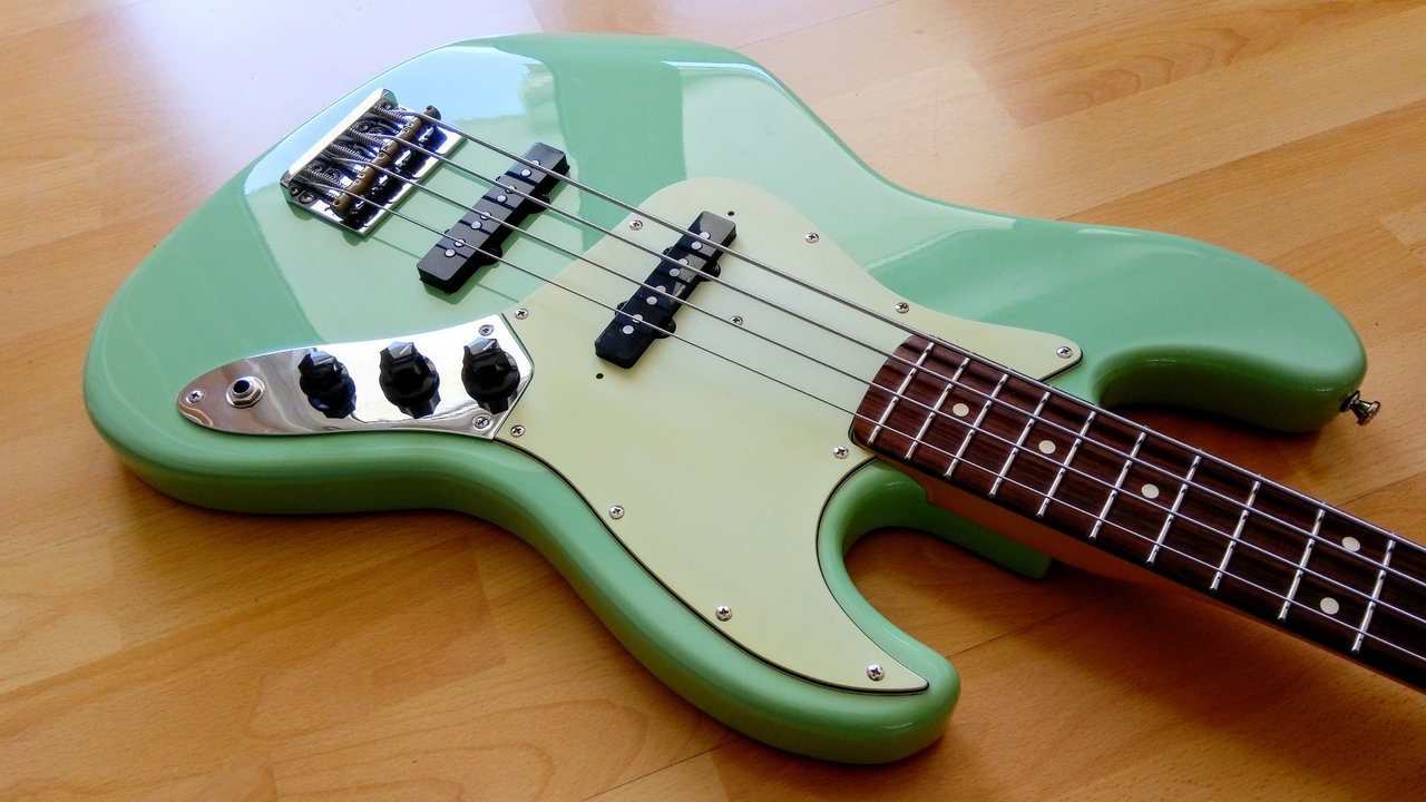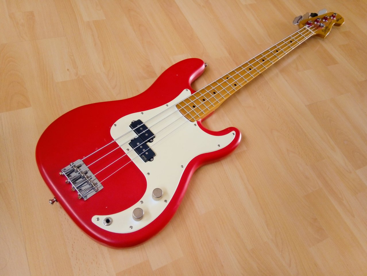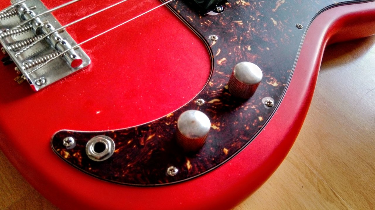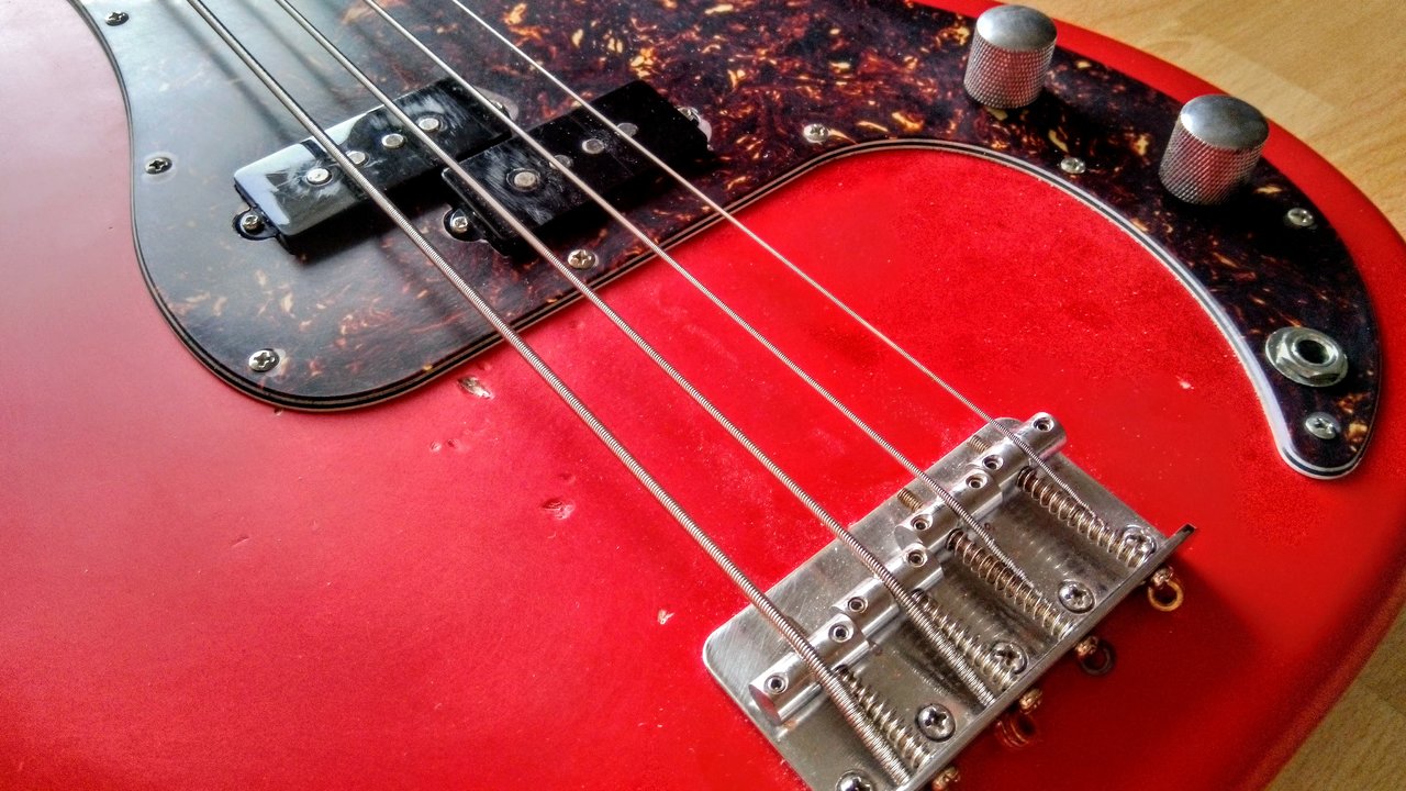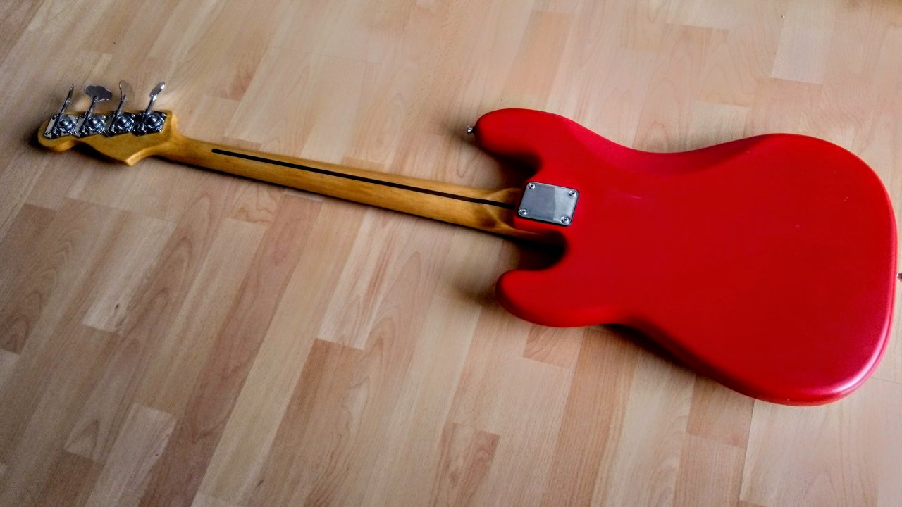 Von einem Precision Bass in Fiesta Red war ich schon lange rein optisch angetan, aber das was es am Markt gibt ist nicht zu bezahlen und/oder mit breitem Hals für mich nicht spielbar. Irgendwann kann mir bei eBay Kleinanzeigen dann der Body für einen Spottpreis vor die Flinte (komplett loaded, inklusive weißem, bzw. echt schön vergilbtem Pickguard). Nicht lange gefackelt, gekauft und dann den an einigen Stellen schon vermackten Hochglanz-Lack mattiert.