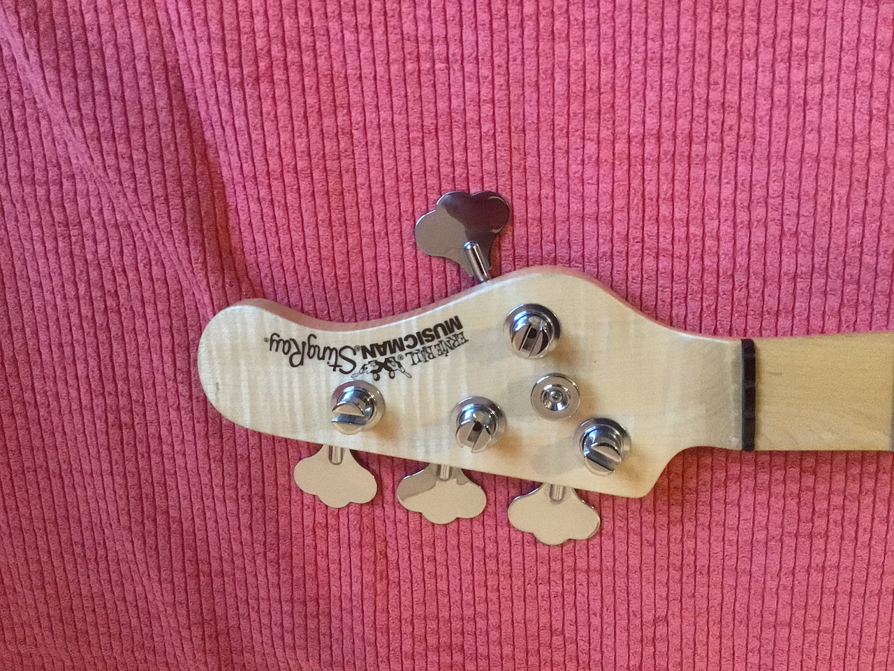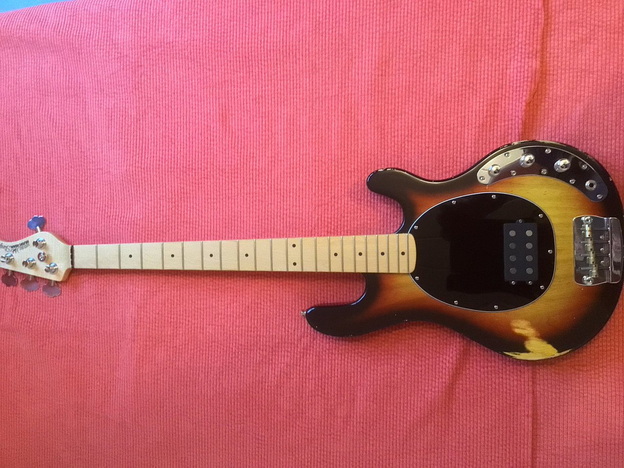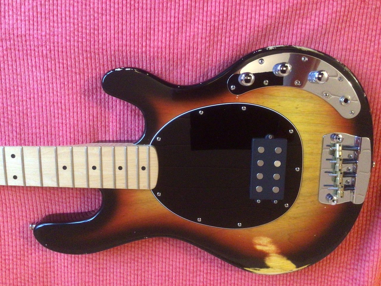 Saiten sind auch schon drauf und jau - klingt wie ein Ray! Kein Vergleich zu dem Sterling 3-Bänder, den ich mal hatte. Der hier hat den richtigen „Zing“, der andere hatte den nicht. Body von Thorsten Meissner (Swamp Ash, 2-teilig), Hals Fame MM400, Mechaniken Schaller, Pickup ist von Rockinger, Elektrik John East, Lack Mattia Franchin.