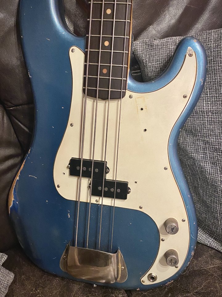 Fender, dem ich anstatt des 63er Decals ein 62er Decal verpasst habe. Dazu die obligatorischen Vintage Reverse Tuner von Fender, die ebenfalls ein Relic bekommen haben. Das PG ist ein 12 Jahre altes Fender Original von der damaligen American Vintage Serie und natürlich das volle Lametta Programm mit ebenfalls geageden Fender Covern