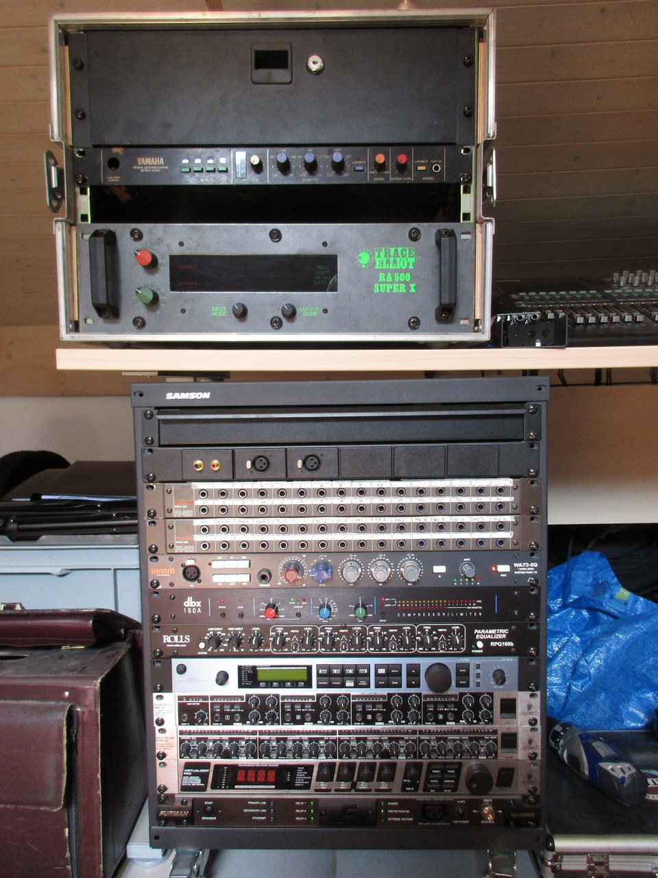 Behringer v-bass (wenn überhaupt nur noch als Effekt, kann eigentlich weg, gibt nur kein Geld mehr für), ein Yamaha-tapedeck und ein Sony MD-recorder. anwählbar über die patchbay darüber.