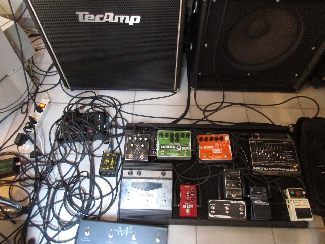 auf dem Tisch rechts mein effektboard für bass*. rechts daneben Marshall Umschalter für die 2 Kanäle des Amps