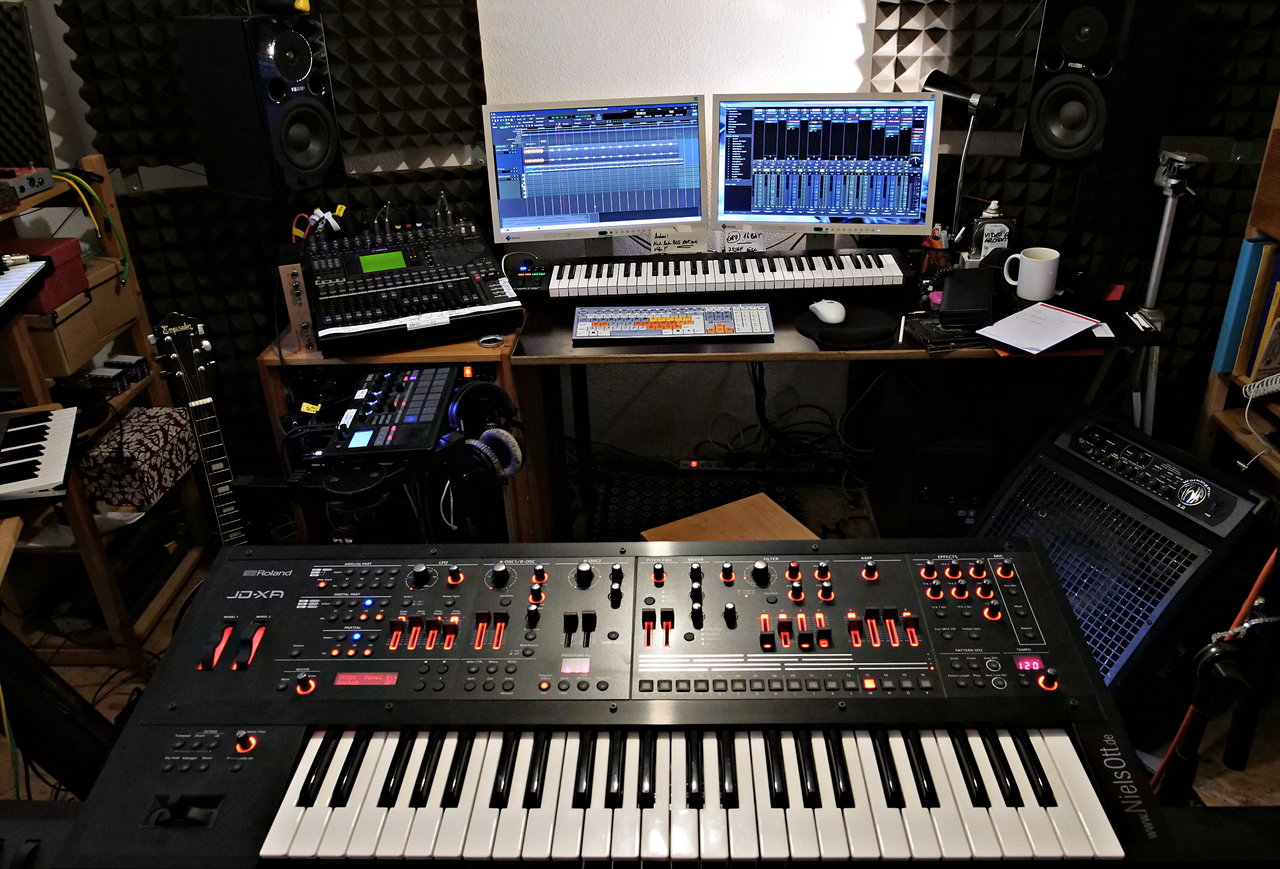 Seit 2006 Ardour-User, seit 1998 Linux-User. Mittlerweile arbeite ich auch oft mit MixBus 7. Der Raum ist recht klein, die Summen-EQs sind entsprechend verbogen und auf den Sitzplatz abgestimmt. Die alten Fostex-Boxen kenne ich in- und auswendig. Zur Zweitmeinung dient derzeit ein DT1770 Kopfhörer und natürlich Gegenchecks im WG-Esszimmer (Yamaha Hifi) etc. - die Zentrale ist ein Yamaha 01v96i Mischpult, das ich nun auch schon 9 Jahre habe. Via ADAT geht's 24kanalig in den PC. Rechts sieht man meinen Lieblings-Amp von SWR, darunter sieht man nicht ein Pedalboard mit u.a. einem optional zu verwendenden Eden WTDI Preamp. Diverse Keyboards und Bässe verstecken sich jenseits der Bildränder.