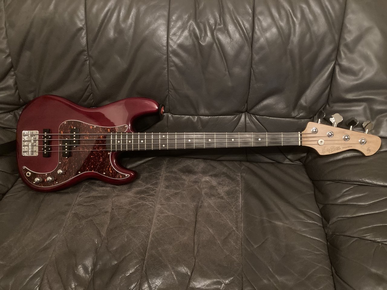 Harley Benton PJ4-HTR, Bj. 2020, Made in China. Eigentlich nur als "Notlösung" für den Wieder-Einstieg gedacht hat sich der Bass inzwischen zu meinem Lieblings-Bass gemausert. Der produziert einen Klang, der sehr nahe an dem liegt, wie ein Bass für mich (heutzutage) klingen soll. Auch mit der Form und Farbe habe ich mich inzwischen angefreundet, anfangs war das so gar nicht meins. Das Feeling beim Spielen passt IMO auch irgendwie sehr gut zu dem eher vintage-mäßigen Klang. Aktuell spiele ich eigentlich nur diesen Bass. Der steht auch immer griffbereit im Wohnzimmer.