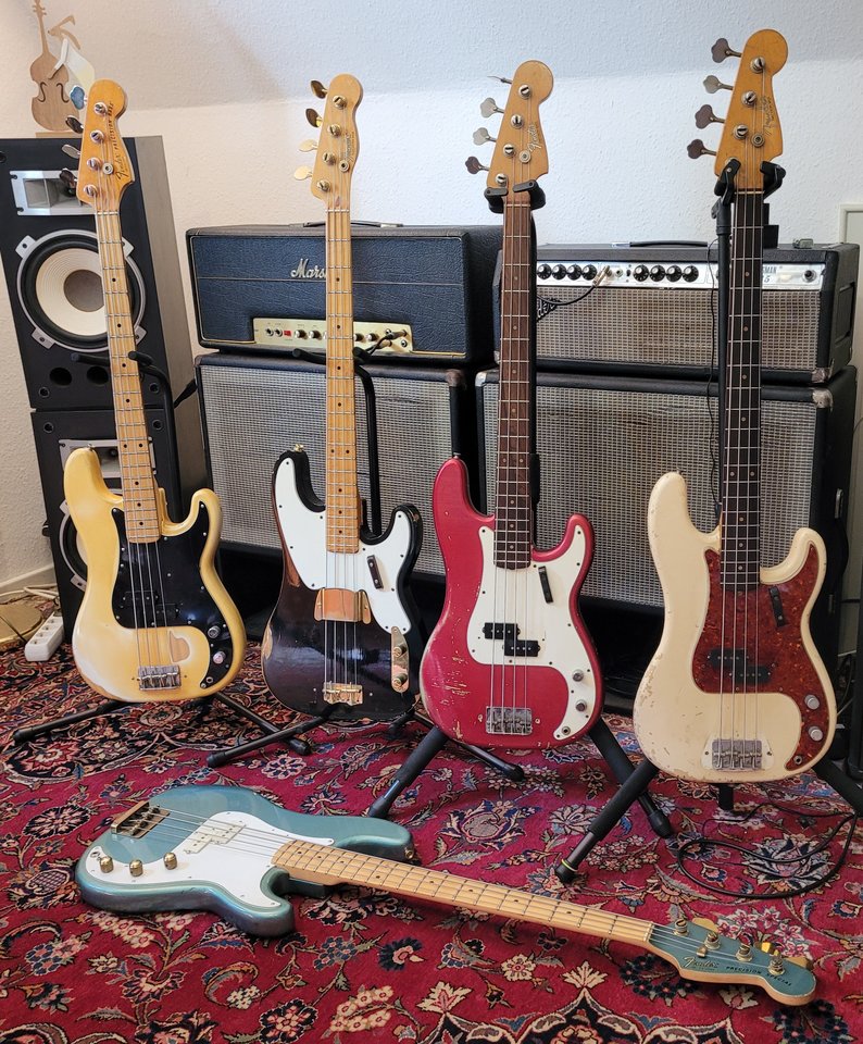 Der linke ist mein erster Bass, Squier JV von ‘82, den org. Hals hatte ich fretless gemacht und ein Ebenholzgriffbrett draufgeleimt, dann doch gegen einen Rockinger Maple Neck getauscht. Der Bass ist eine alte Hassliebe. Der rechte ist nicht meiner, ist ein Japan Fender von ‘91
