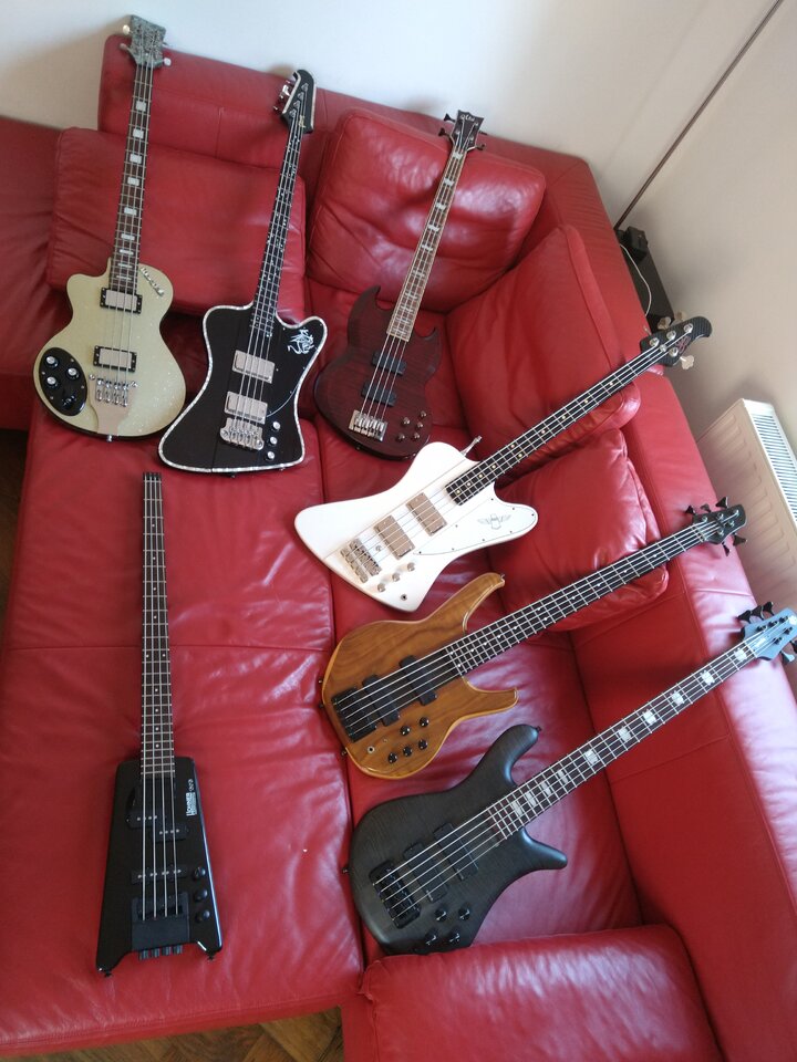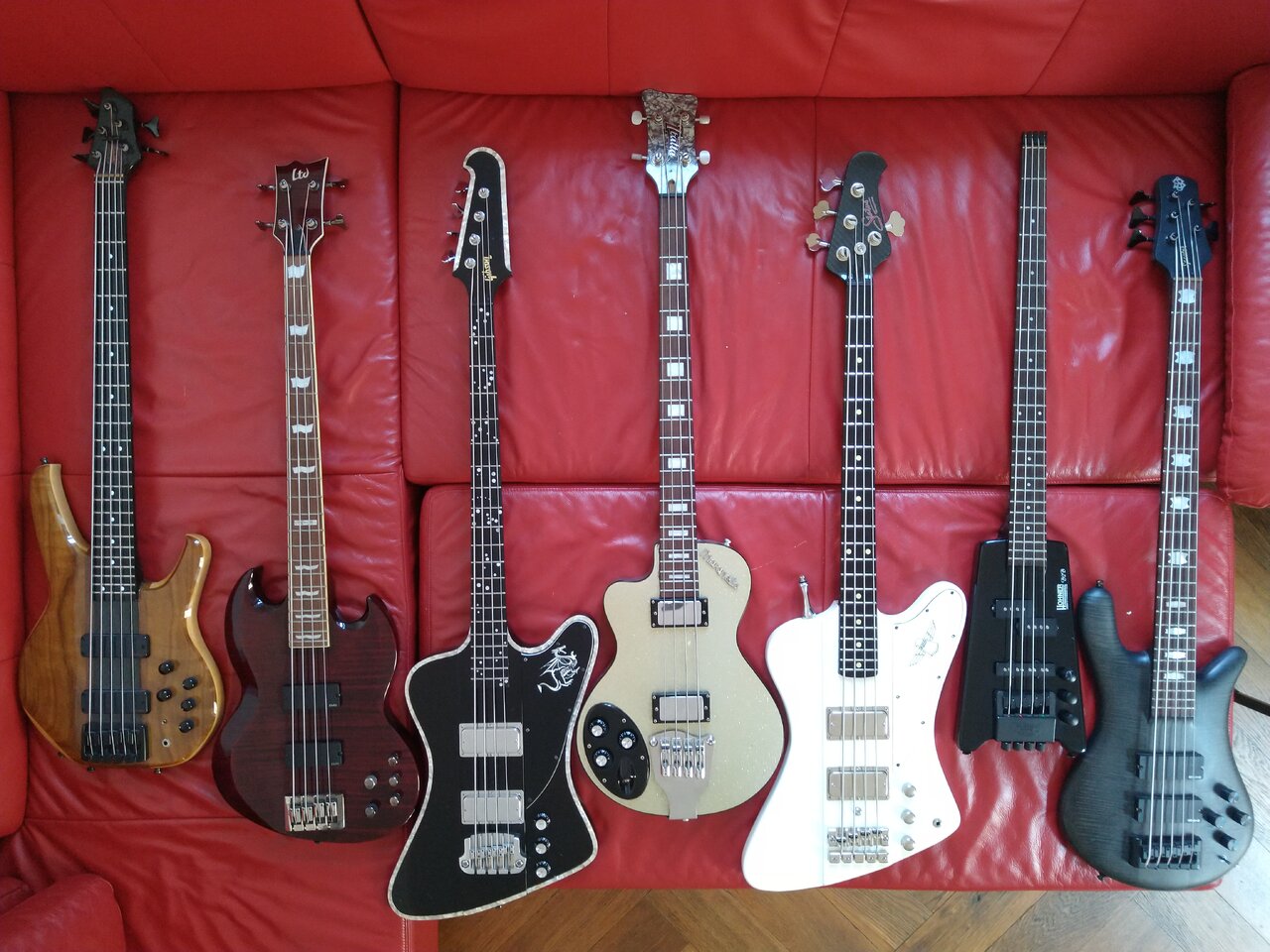 v.l.n.r.: Status Empathy, LTD Viper, Gibson Thunderbird, Italia Maranello, Ray'nBird, Hohner B2B; Spector LX5.![]()