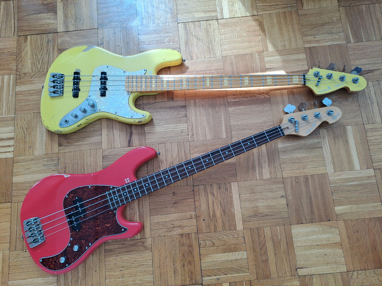 Auf der anderen Seite meine beiden Japan Fender Bässe von Restauracja gitar. Super Bässe, die spitzenmäßig zusammengestellt wurden. Die original Pickups waren sehr schwach auf der Brust. Im Preci ist jetzt ein Kloppmann und im Jazzy ein Häussel.
