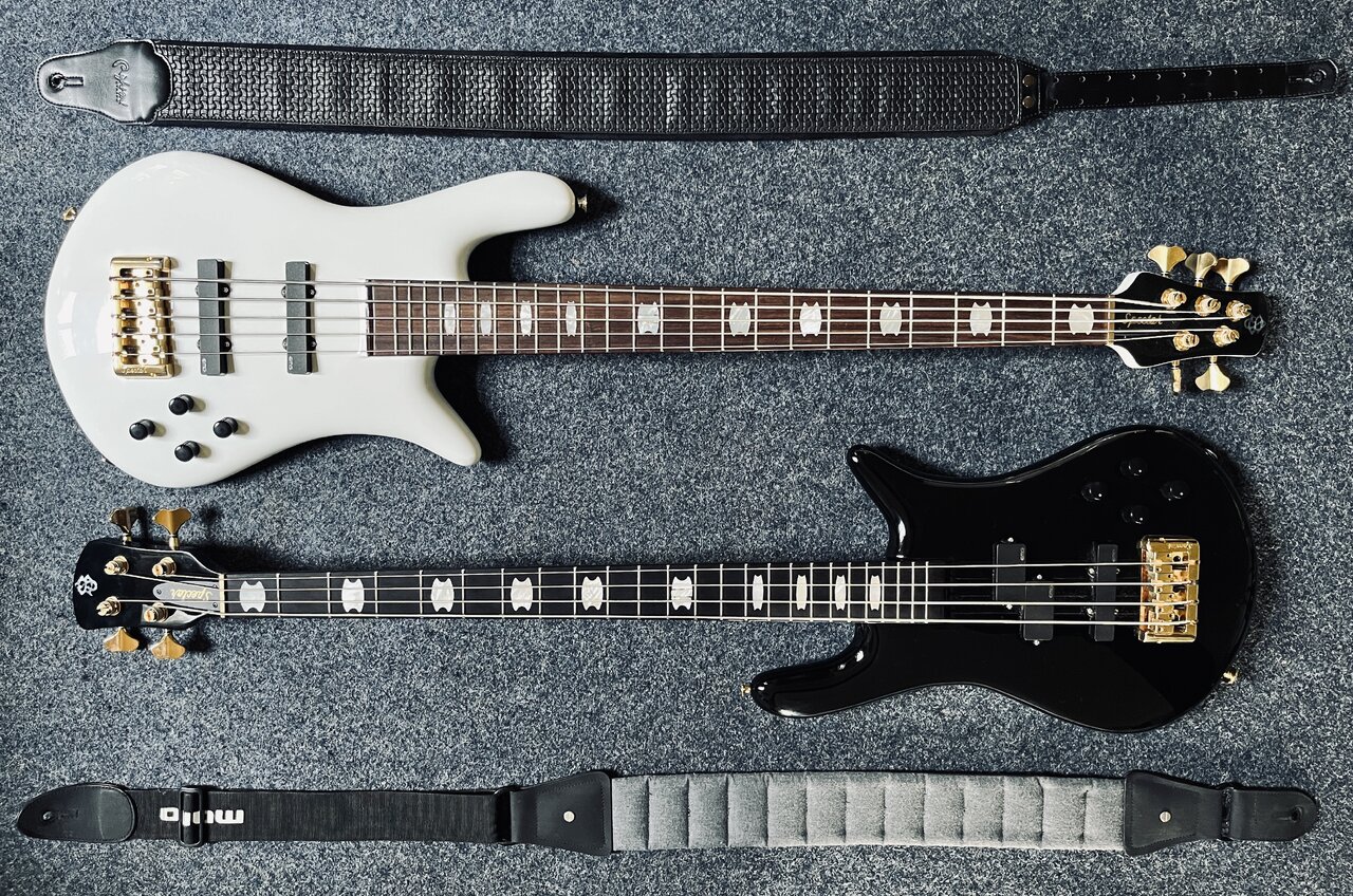 Der 5er ist ein Classic, der 4er ein 2016er Euro 4LX in solid black. Der sollte noch keinen gekammerten Korpus haben, wiegt aber trotzdem nur 4Kg. Dazu halt die Tonepump statt der EMG Elektronik und, was super zum Bass passt, Ebony statt Palisander Fretboard. Ist mir letztes Jahr zu einem super Preis zugelaufen, da konnte ich nicht Nein sagen. Die Beiden ergänzen sich schön: der 5er klingt holziger und „Edelbassiger“, der 4er hat den klassischen 80s Spector PJ Sound.Sieht nach den Euro Classic Bässen aus. Habe den 4-Saiter in Weiß.
