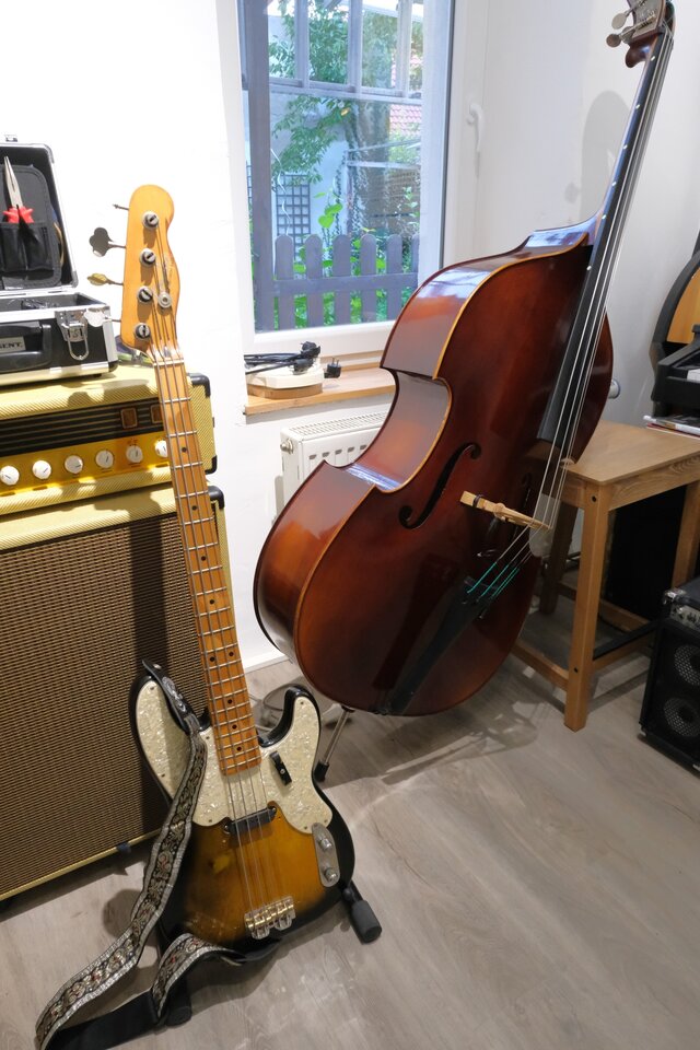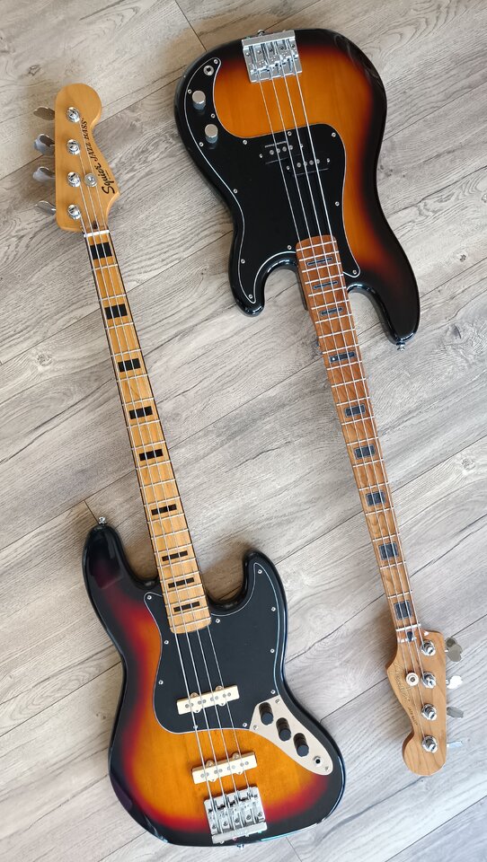 Da habe ich ein ähnliches Pärchen. Squier JV + Preci Frankenstein.Das sind die Beiden, die mich aktuell am meisten begleiten. Der Precision ist die unangefochtene Nr.1, zum Jazz Bass greife ich allerdings auch relativ oft.
