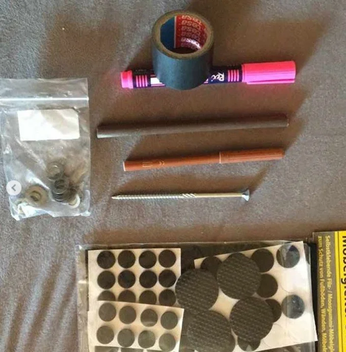 Zutaten: Schraube, Rohr vom Filzstift, dann dickeren Rohr vom runden Textmarker, Scheiben und Filz dazwischen,